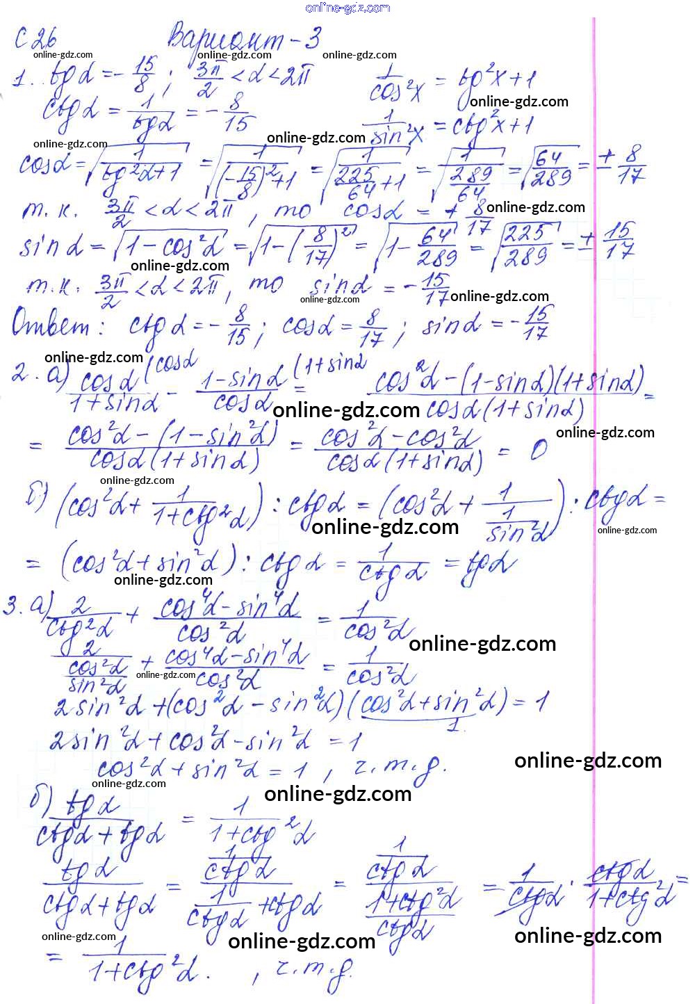 Готовые домашние задания по Алгебре за 9 класс Контрольные и самостоятельные работы Журавлев, Малышева УМК 2016 - С-26. Тригонометрические тождества и их применение Самостоятельные работы Вариант №3