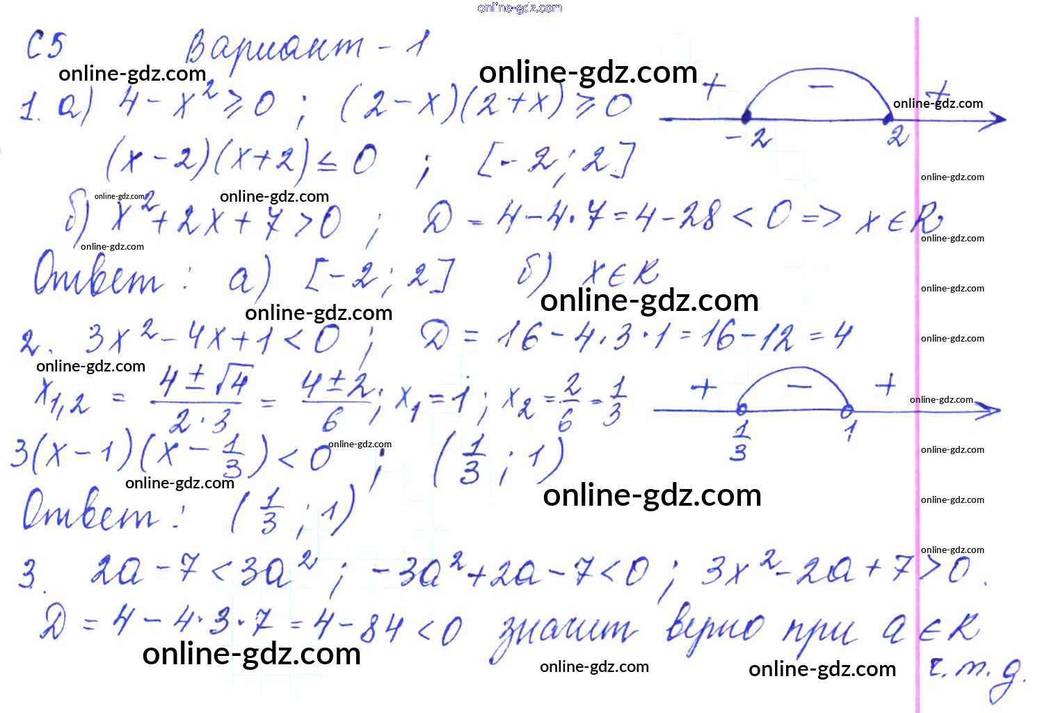Готовые домашние задания по Алгебре за 9 класс Контрольные и самостоятельные работы Журавлев, Малышева УМК 2016 - С-5. Решение квадратичных неравенств Самостоятельные работы Вариант №1