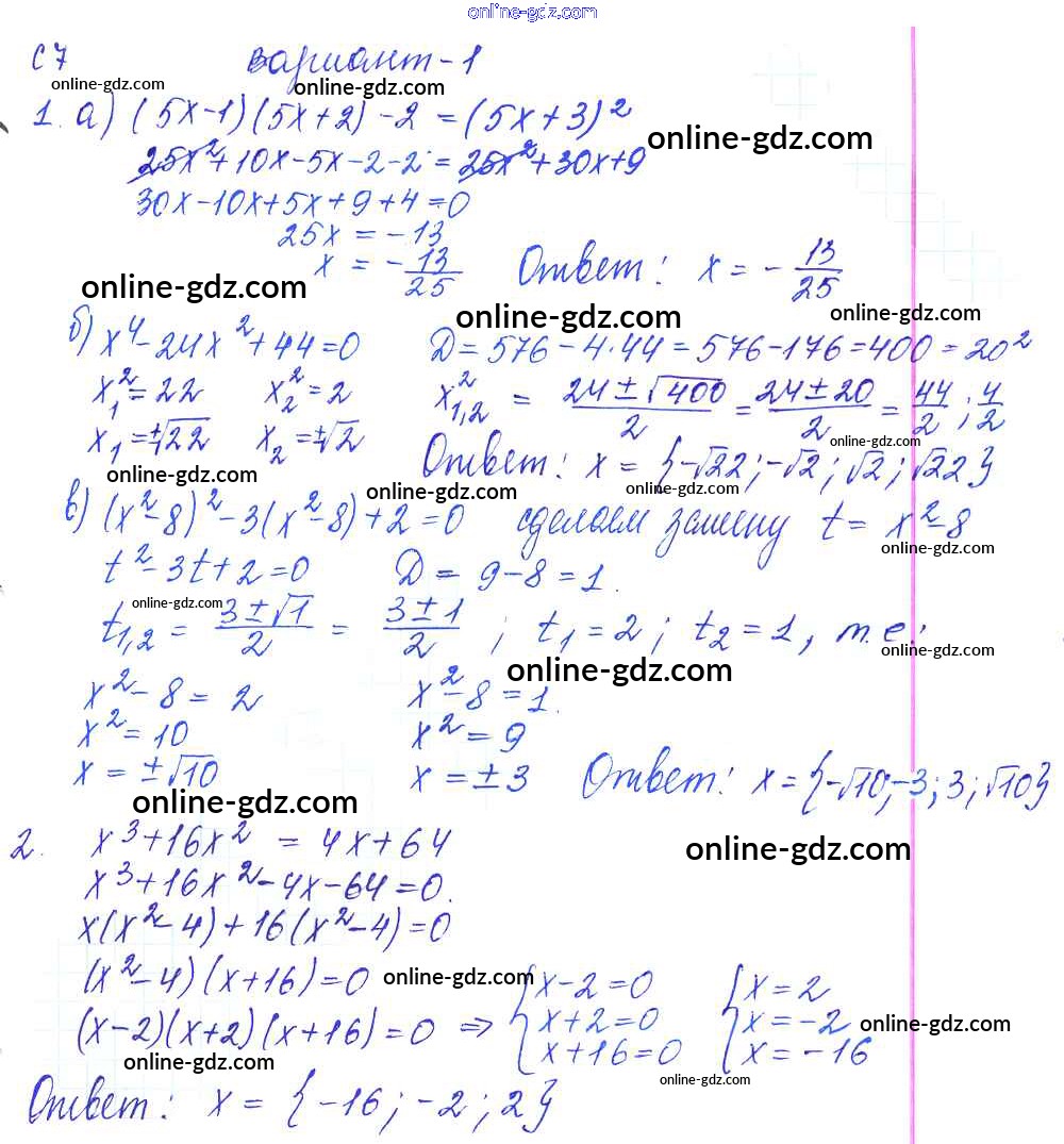 Готовые домашние задания по Алгебре за 9 класс Контрольные и самостоятельные работы Журавлев, Малышева УМК 2016 - С-7. Решение целых уравнений Самостоятельные работы Вариант №1
