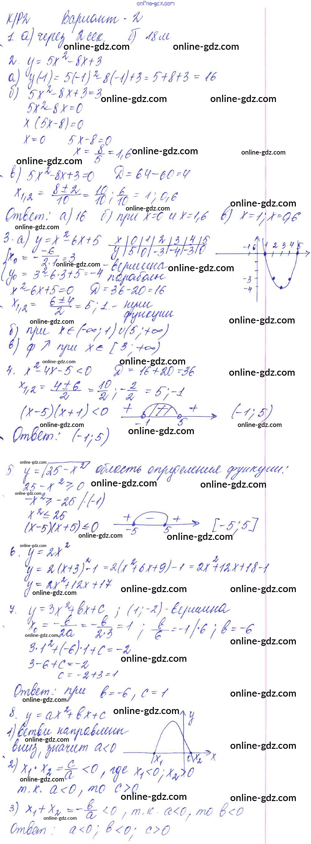 Готовые домашние задания по Алгебре за 9 класс Контрольные работы Кузнецова, Минаева 2016 - КР-2. Квадратичная функция вариант №2