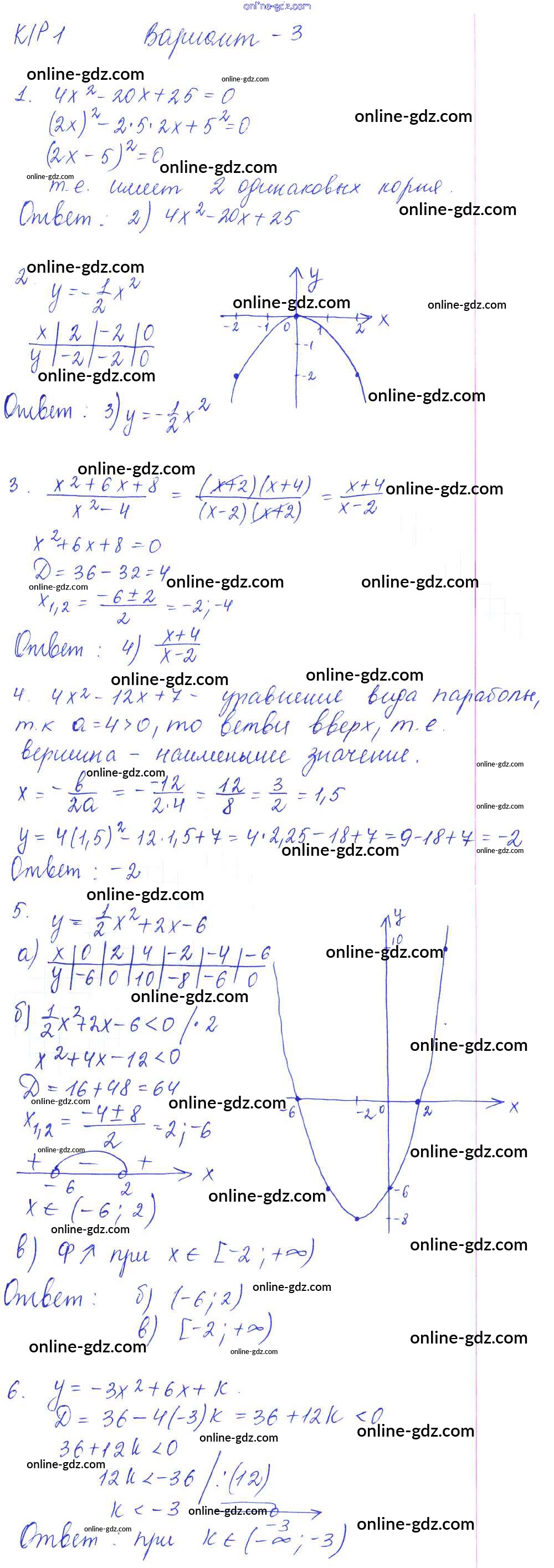 Готовые домашние задания по Алгебре за 9 класс Самостоятельные и контрольные работы Глазков, Варшавский УМК 2013 - КР-1. Функции и их свойства. Квадратный трехчлен. Квадратичная функция и её график Контрольные работы вариант 3