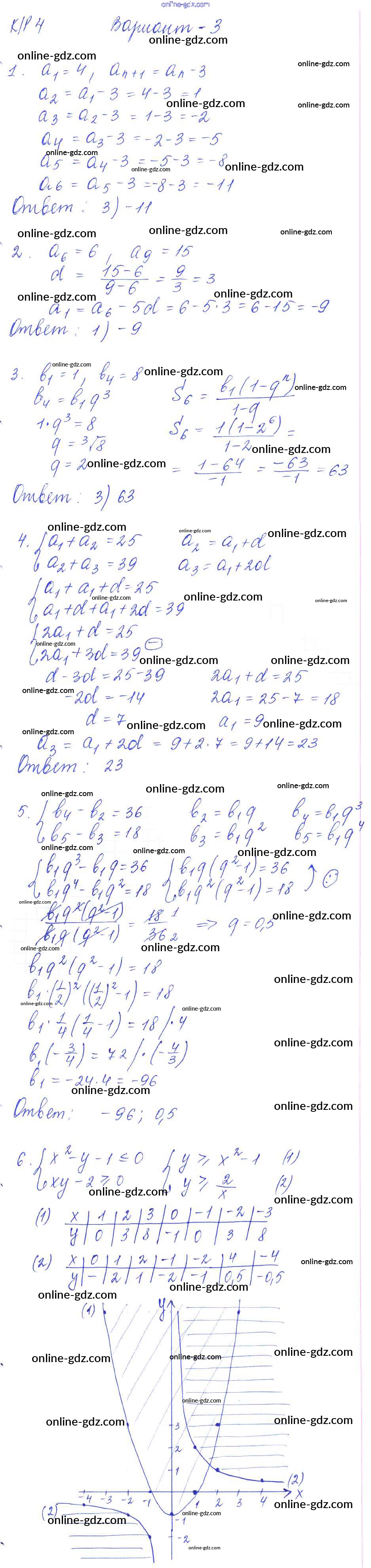 Готовые домашние задания по Алгебре за 9 класс Самостоятельные и контрольные работы Глазков, Варшавский УМК 2013 - КР-4. Неравенства с двумя переменными и их системы. Арифметическая и геометрическая прогрессии Контрольные работы вариант 3