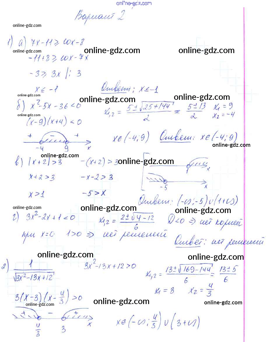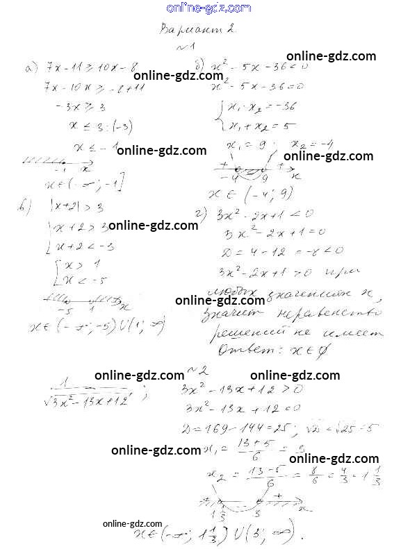 Готовые домашние задания по Алгебре за 9 класс Самостоятельные работы Александрова УМК Базовый уровень 2016 - СР-1. Линейные и квадратные неравенства Тема 1. Неравенства и системы неравенств вариант 2