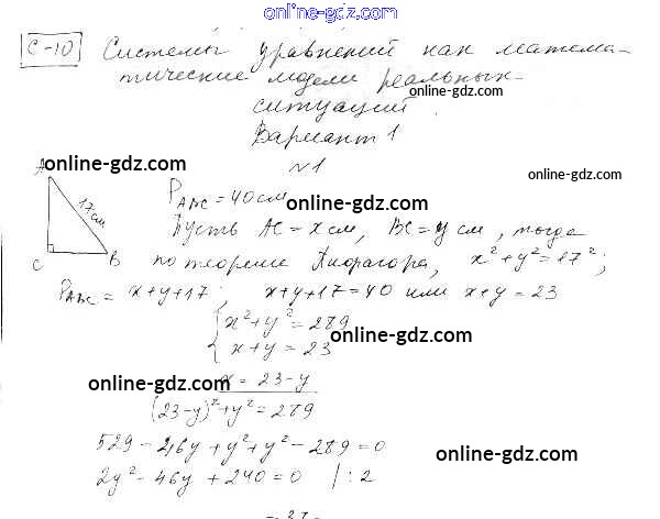 Готовые домашние задания по Алгебре за 9 класс Самостоятельные работы Александрова УМК Базовый уровень 2016 - СР-10. Системы уравнений как математические модели реальных ситуаций Тема 2. Системы уравнений вариант 1