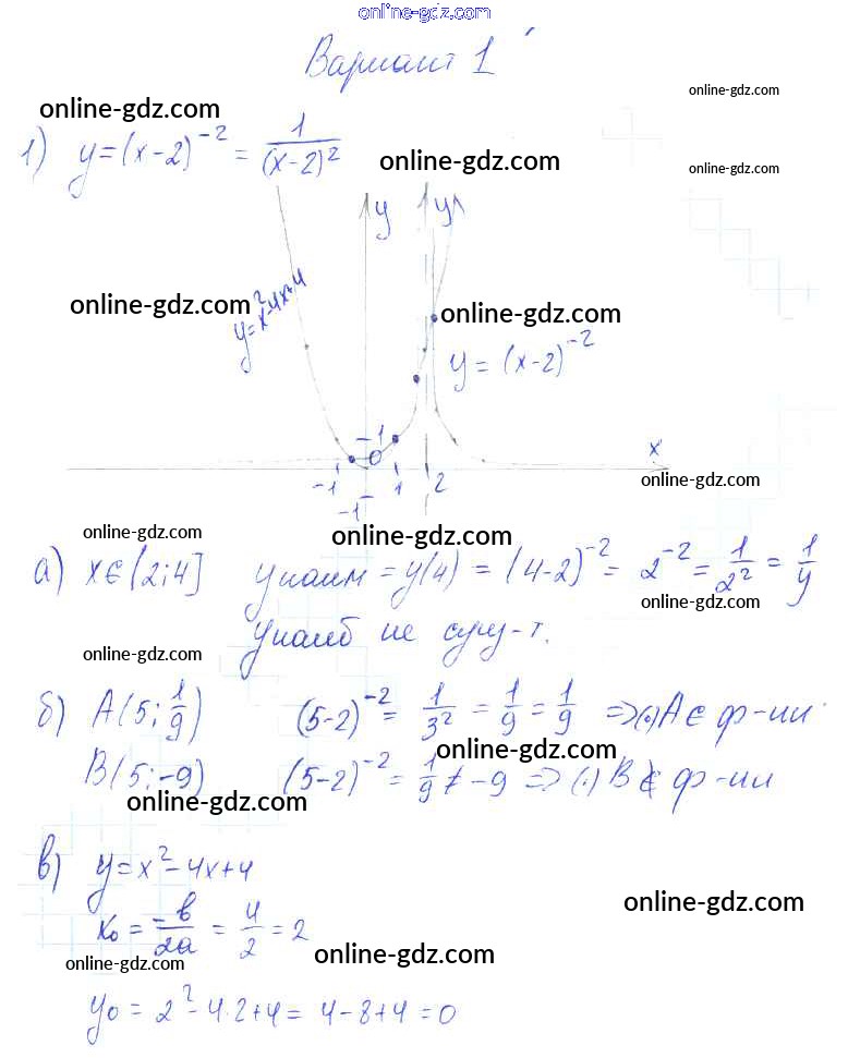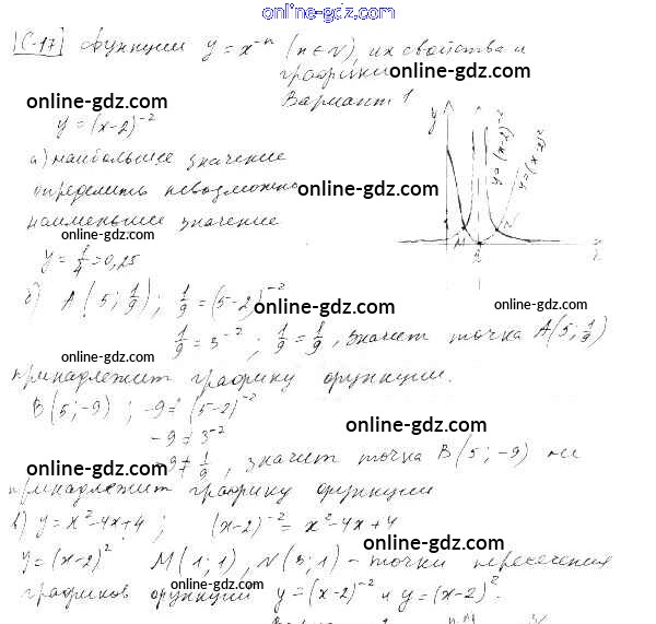 Готовые домашние задания по Алгебре за 9 класс Самостоятельные работы Александрова УМК Базовый уровень 2016 - СР-17. Функции y=x-n (n ∈ N) их свойства и графики Тема 3. Числовые функции вариант 1