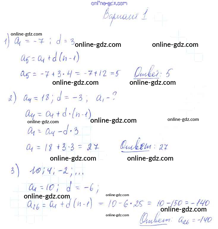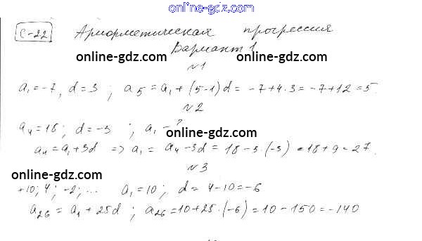 Готовые домашние задания по Алгебре за 9 класс Самостоятельные работы Александрова УМК Базовый уровень 2016 - СР-22. Арифметическая прогрессия Тема 4. Прогрессии вариант 1