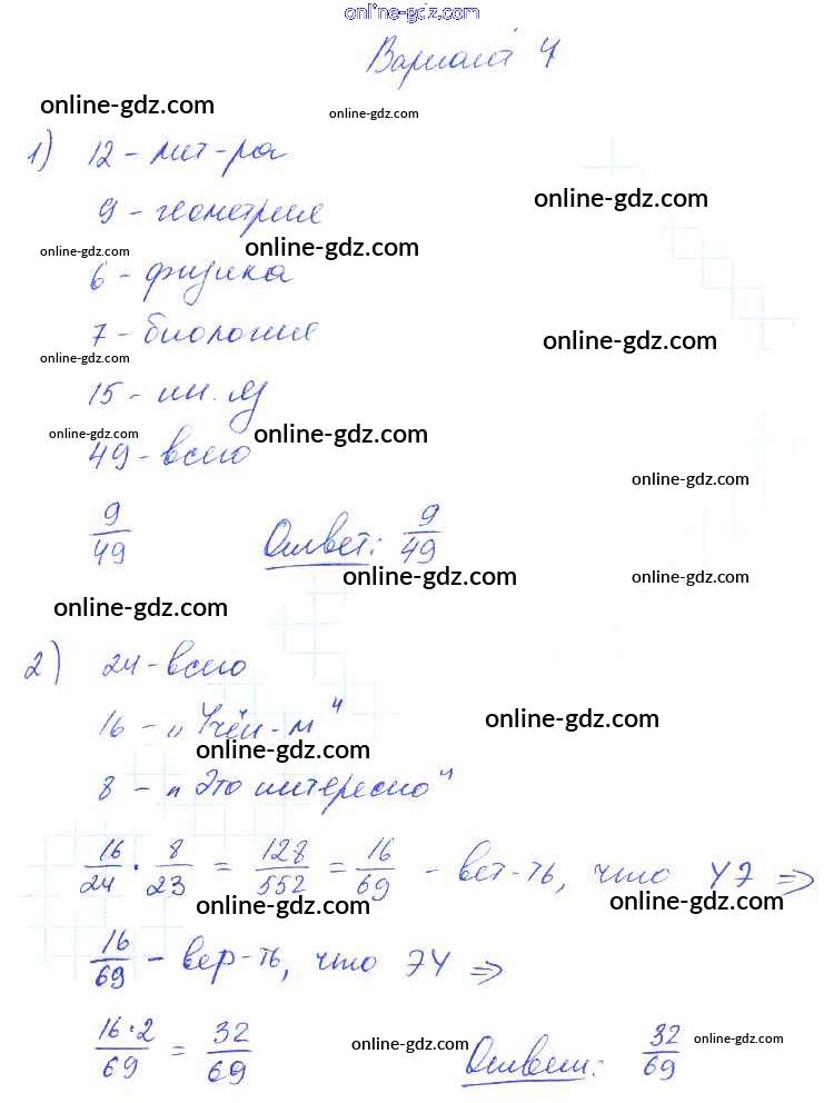 Готовые домашние задания по Алгебре за 9 класс Самостоятельные работы Александрова УМК Базовый уровень 2016 - СР-31. Простейшие вероятностные задачи Тема 5. Элементы комбинаторики, статистики и теории вероятностей вариант 4
