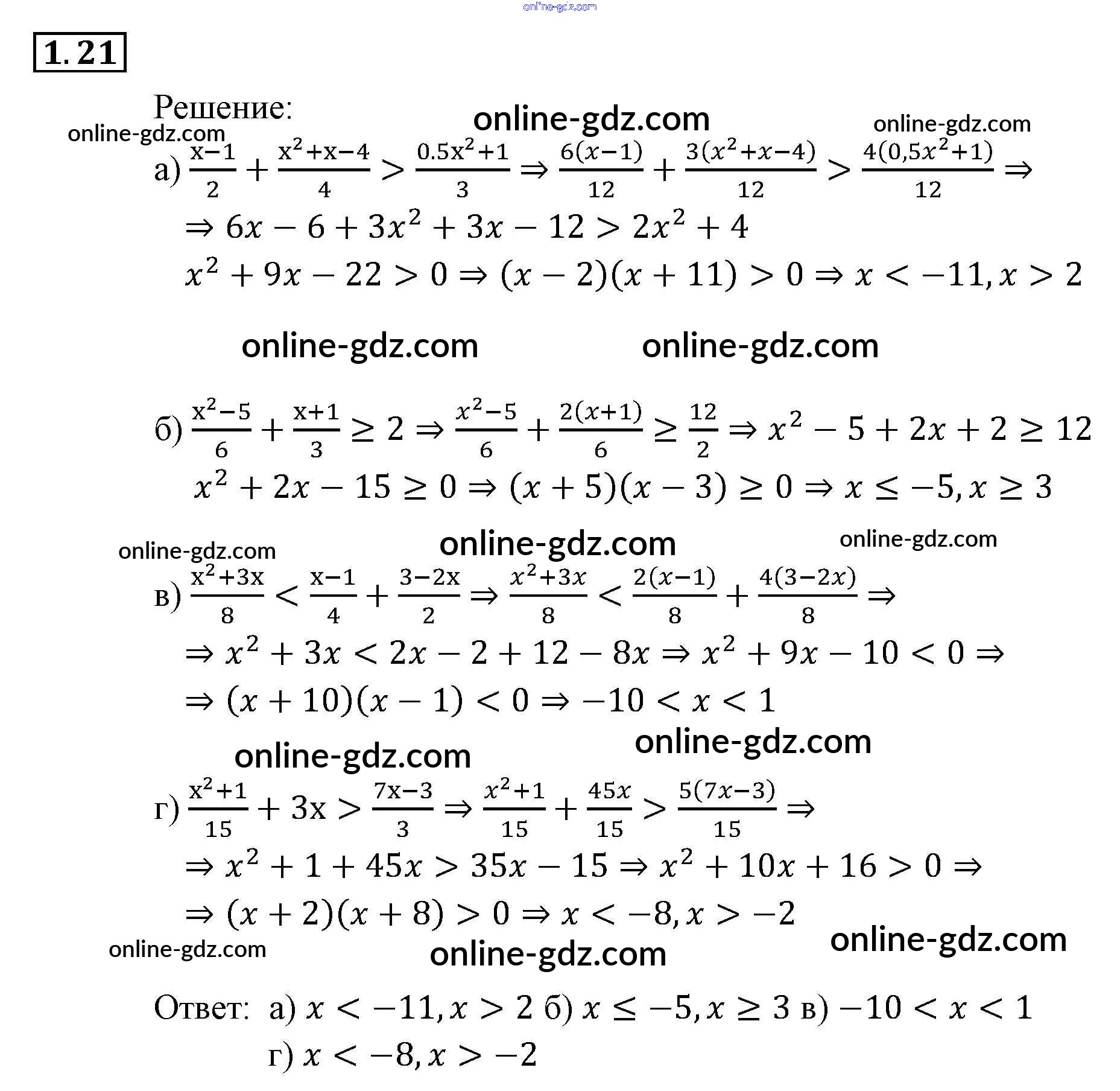 Готовые домашние задания по Алгебре за 9 класс Задачник Мордкович, Александрова 2010 - § 1. Линейные и квадратные неравенства Глава 1. Рациональные неравенства и их системы 1.21