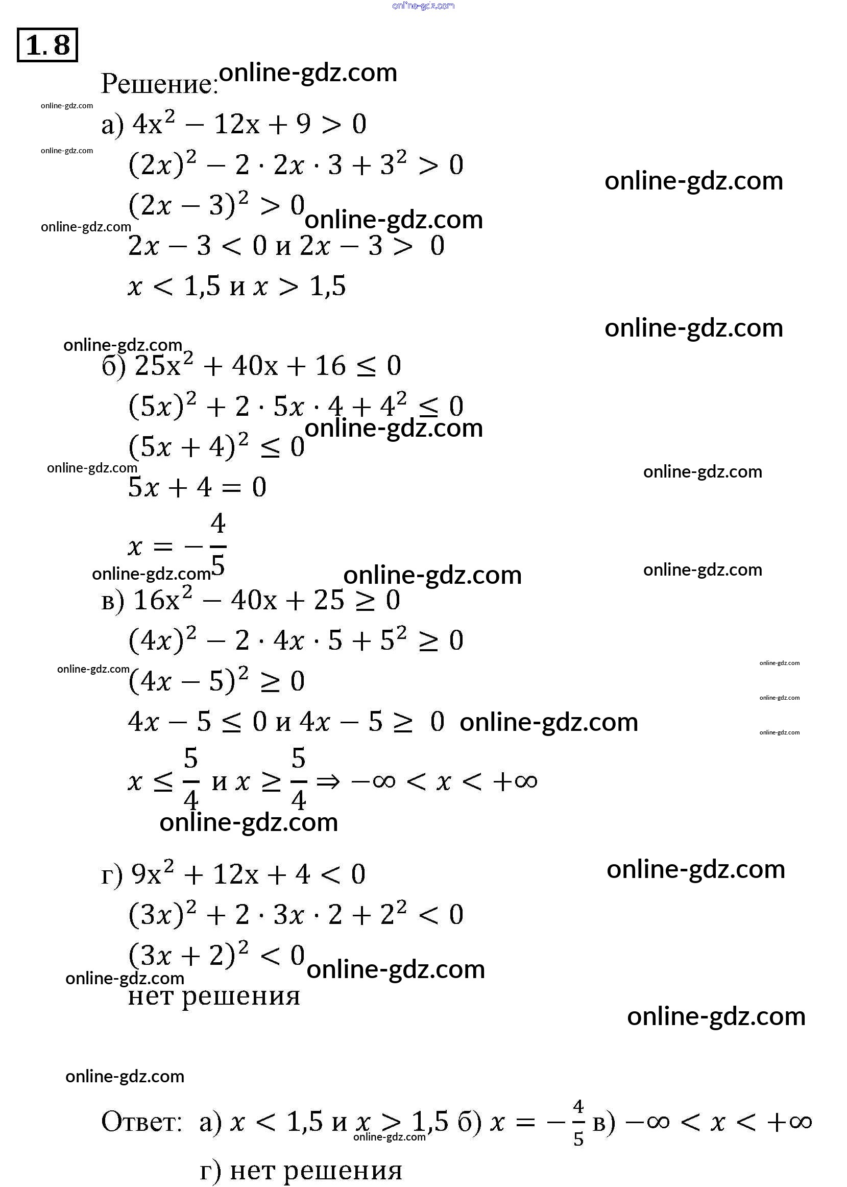 Готовые домашние задания по Алгебре за 9 класс Задачник Мордкович, Александрова 2010 - § 1. Линейные и квадратные неравенства Глава 1. Рациональные неравенства и их системы 1.8