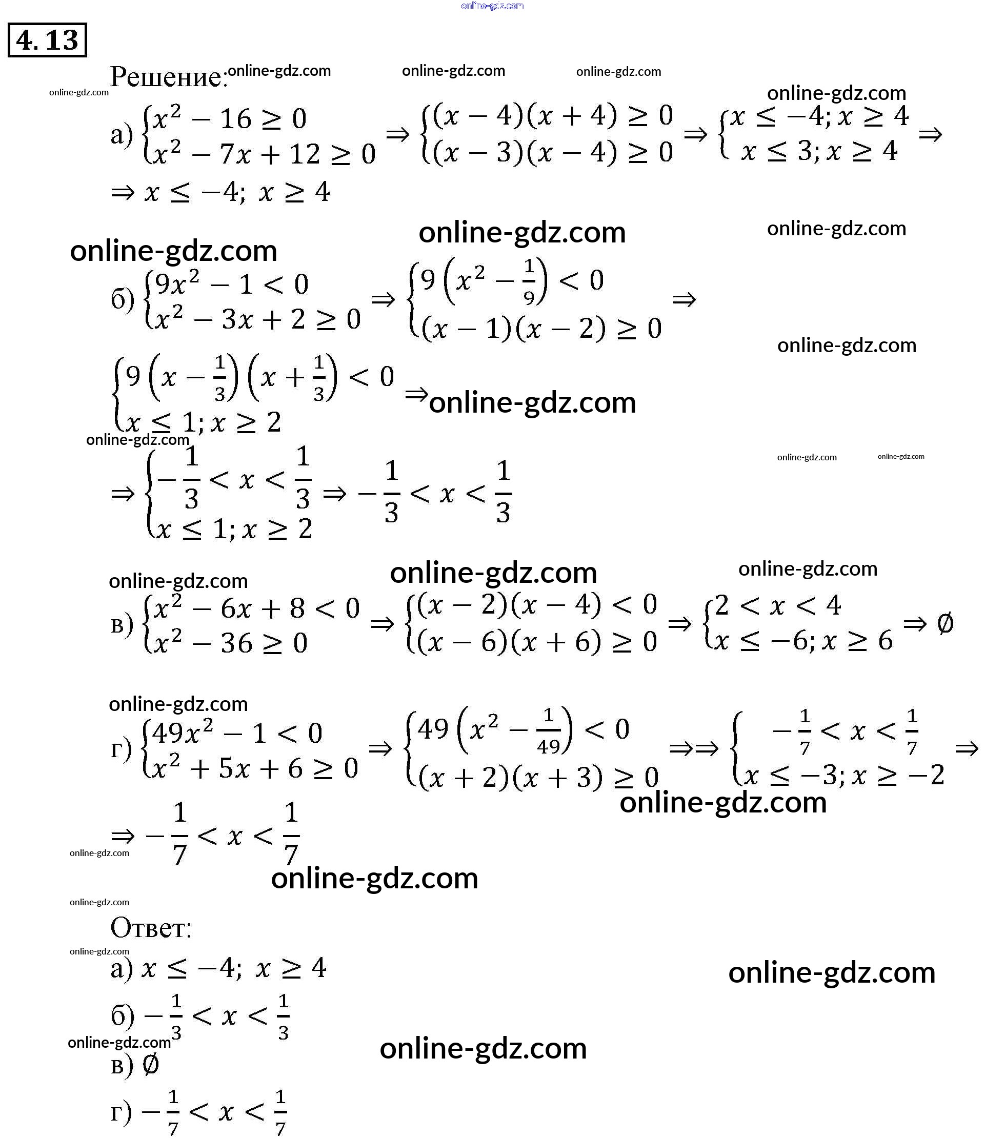 Готовые домашние задания по Алгебре за 9 класс Задачник Мордкович, Александрова 2010 - § 4. Системы рациональных неравенств Глава 1. Рациональные неравенства и их системы 4.13