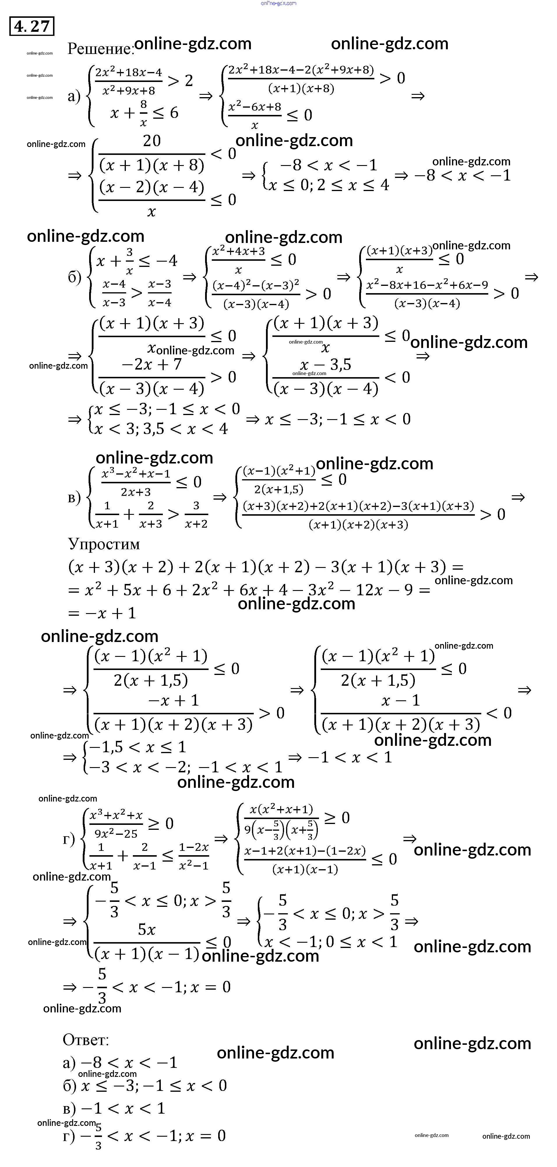 Готовые домашние задания по Алгебре за 9 класс Задачник Мордкович, Александрова 2010 - § 4. Системы рациональных неравенств Глава 1. Рациональные неравенства и их системы 4.27