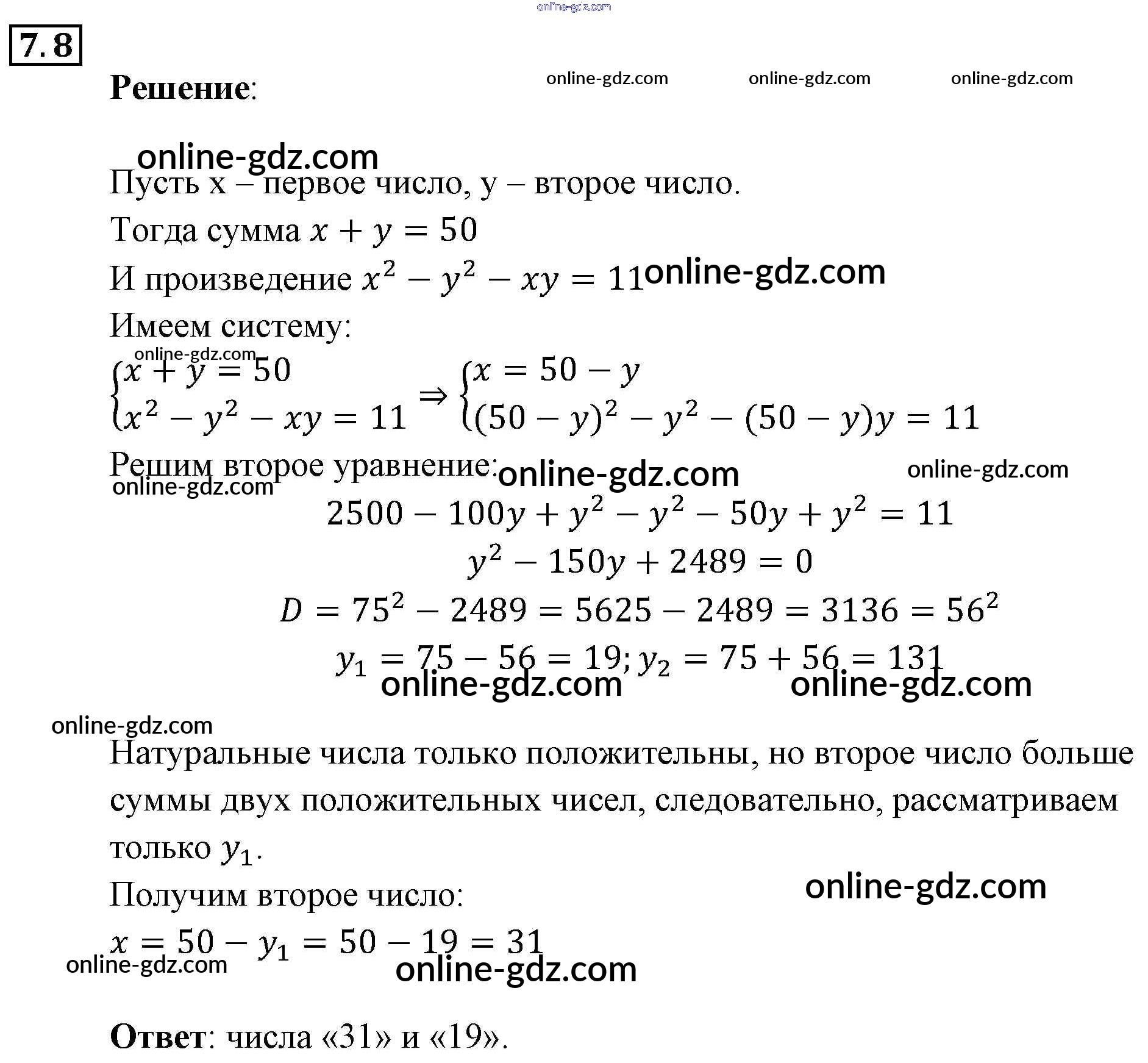 Готовые домашние задания по Алгебре за 9 класс Задачник Мордкович, Александрова 2010 - § 7. Системы уравнений как математические модели реальных ситуаций Глава 2. Системы уравнений 7.8