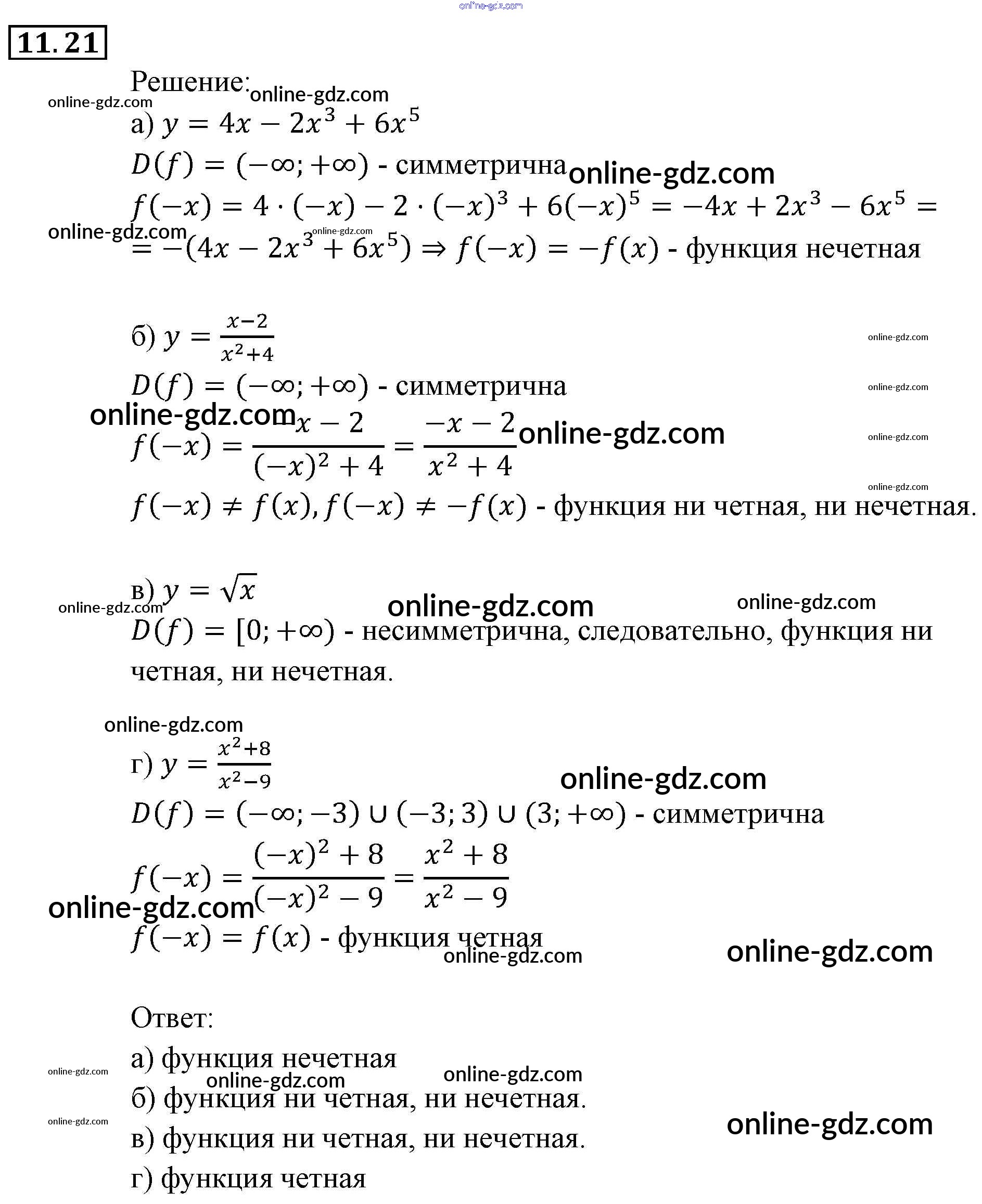 Готовые домашние задания по Алгебре за 9 класс Задачник Мордкович, Александрова 2010 - § 11. Честные и нечестные функции Глава 3. Числовые функции 11.21