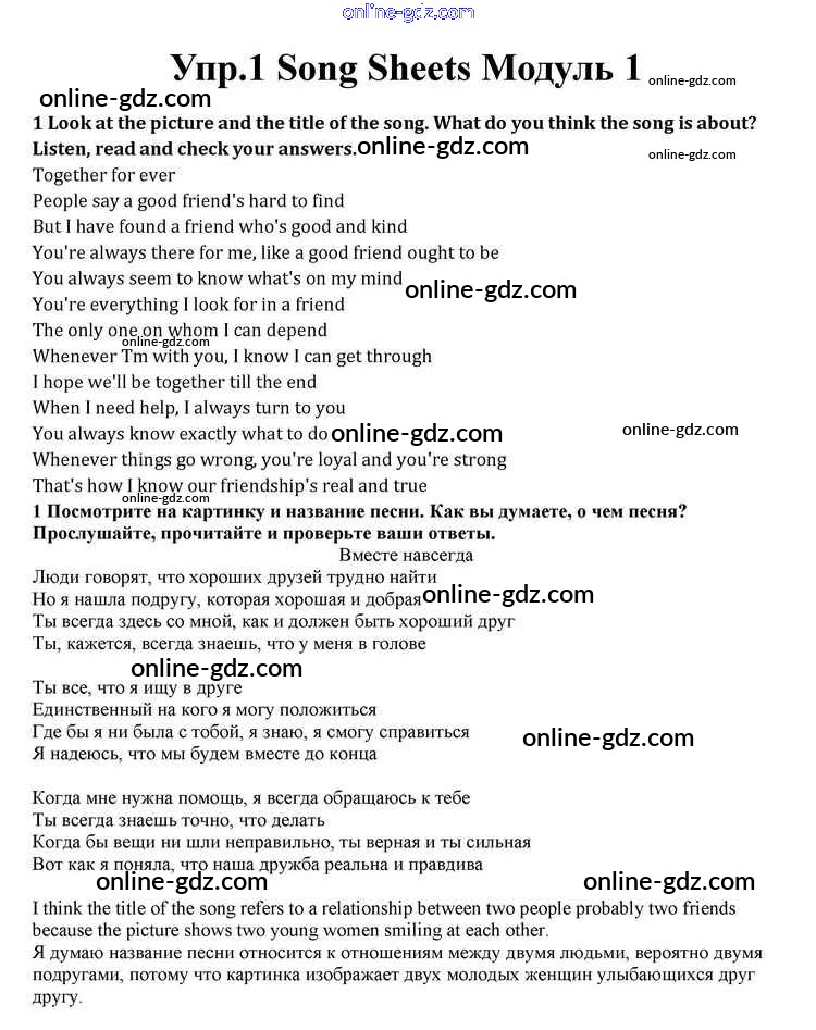 Готовые домашние задания по Английскому языку за 10 класс Учебник Афанасьева, Дули Spotlight 2015 - Module 1 Song Sheets 1
