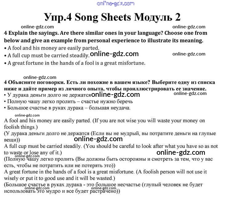 Готовые домашние задания по Английскому языку за 10 класс Учебник Афанасьева, Дули Spotlight 2015 - Module 2 Song Sheets 4