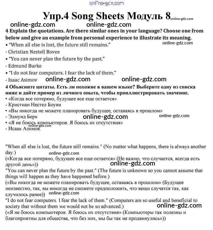 Готовые домашние задания по Английскому языку за 10 класс Учебник Афанасьева, Дули Spotlight 2015 - Module 8 Song Sheets 4