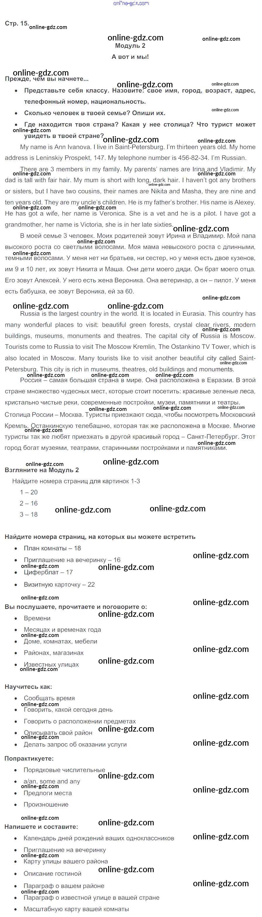 класс, от простых до сложных. Мы стремимся предоставить нашим пользователям максимально точные и полезные ответы к Учебнику Ваулина, Дули Spotlight - Module 2. Here we are! Страницы 15, поэтому мы постоянно работаем над улучшением нашего контента. Мы всегда готовы помочь!