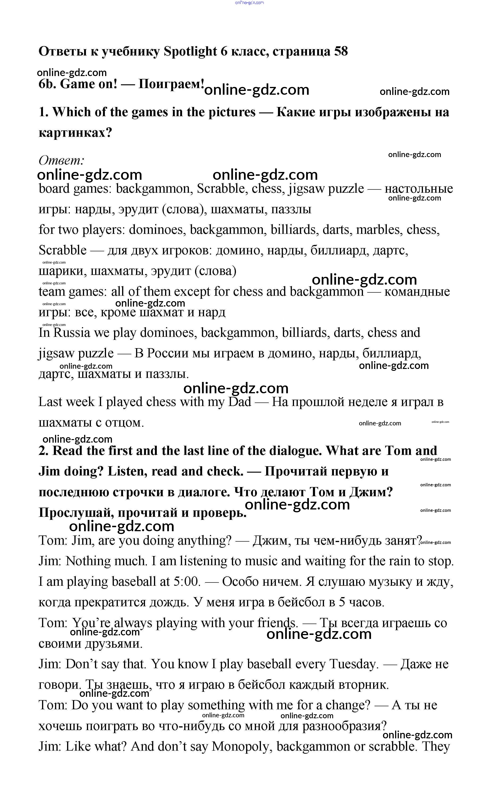 Готовые домашние задания по Английскому языку за 6 класс Учебник Ваулина, Дули Spotlight 2017 - Module 6. Leisure activities. Страницы 58