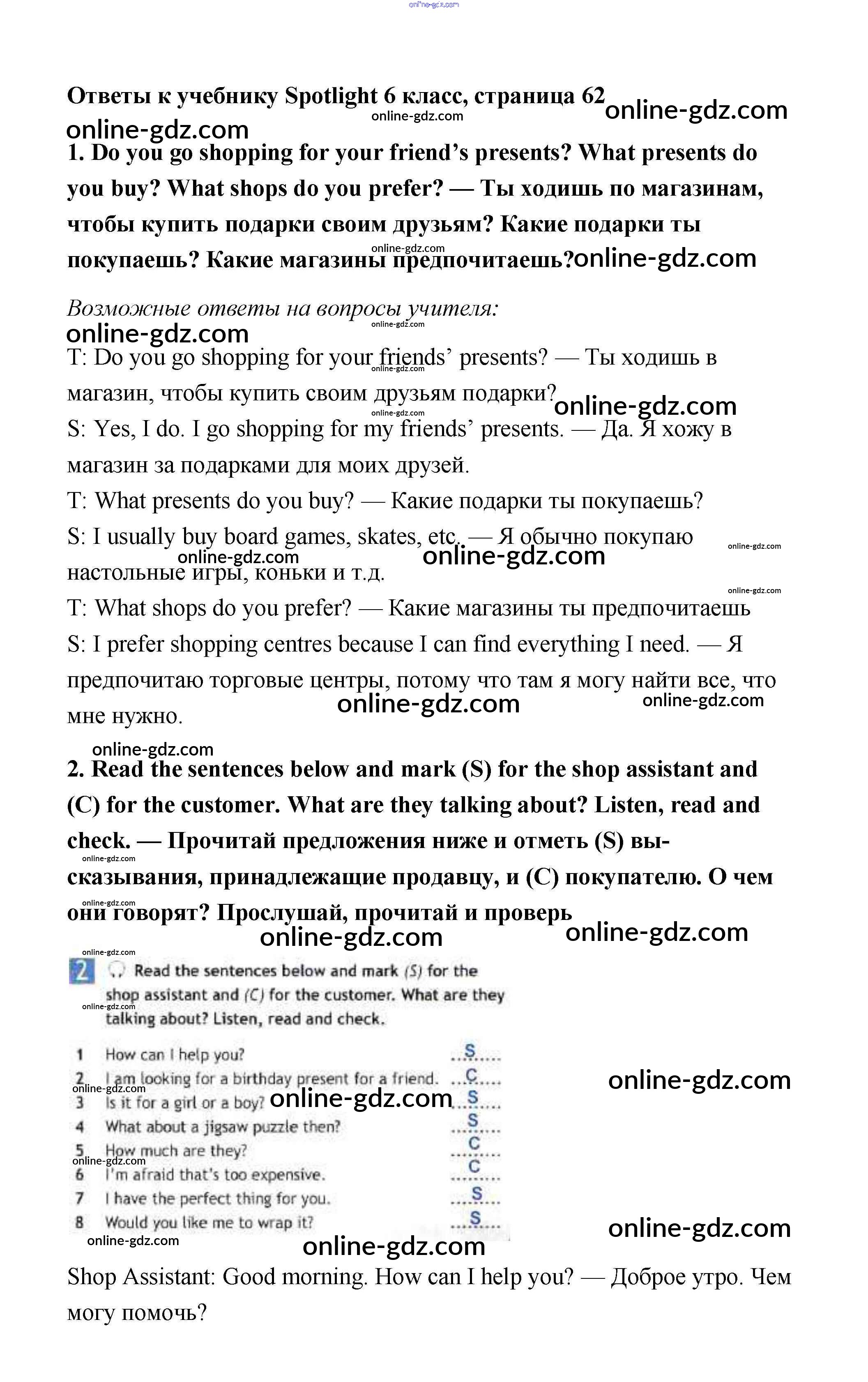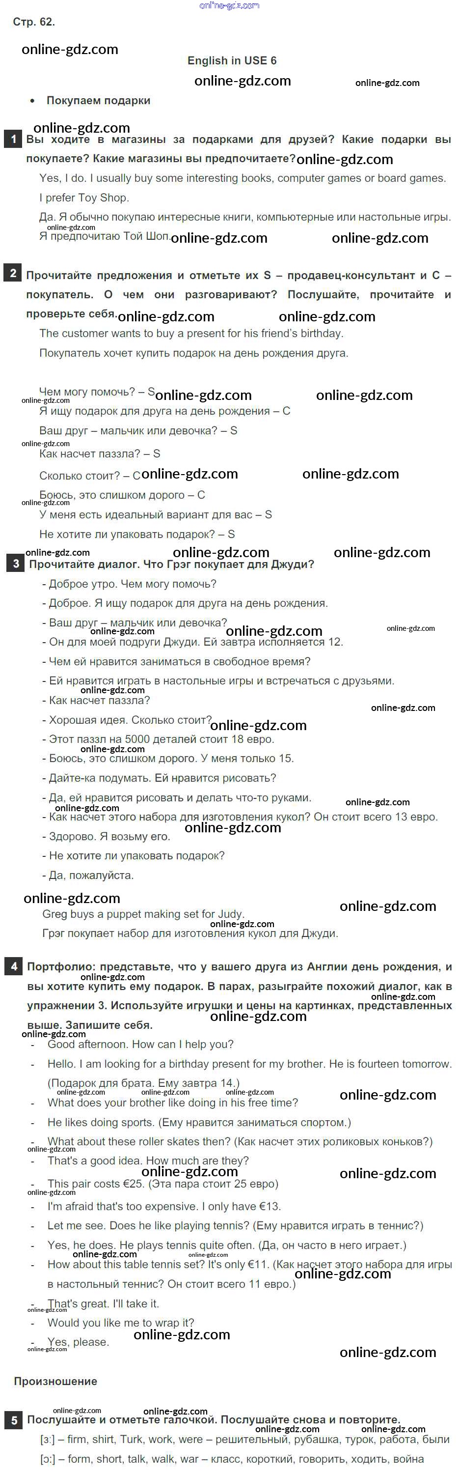 Готовые домашние задания по Английскому языку за 6 класс Учебник Ваулина, Дули Spotlight 2017 - Module 6. Leisure activities. Страницы 62