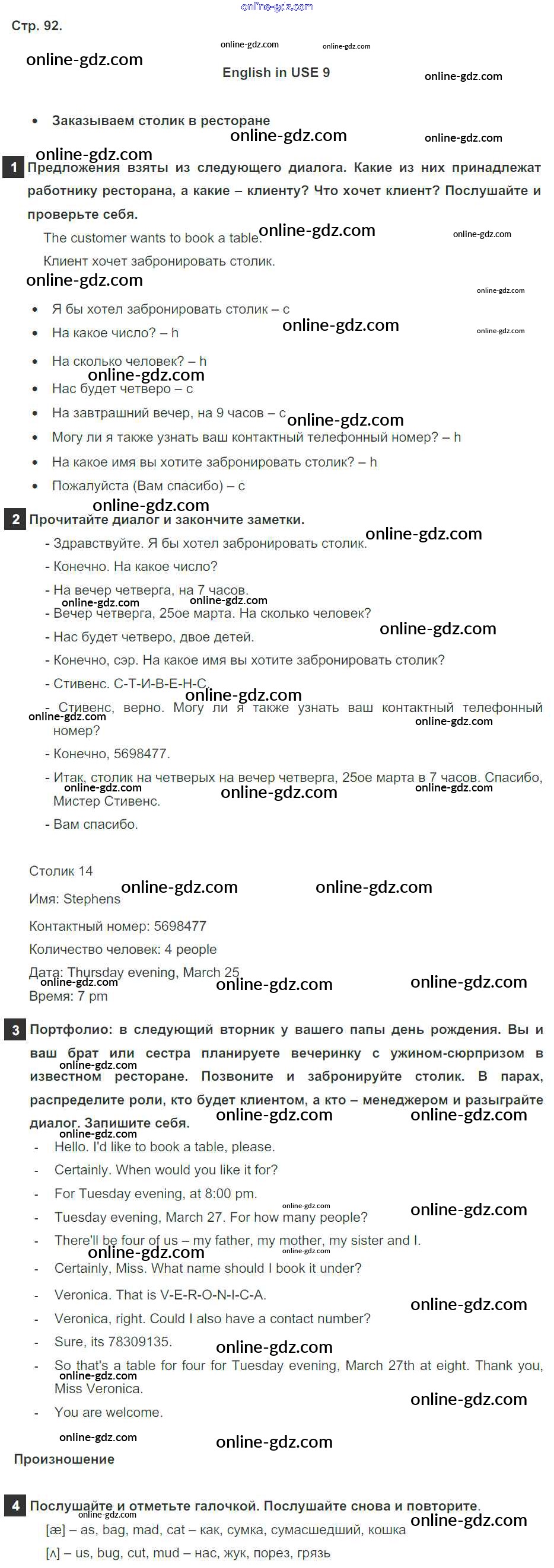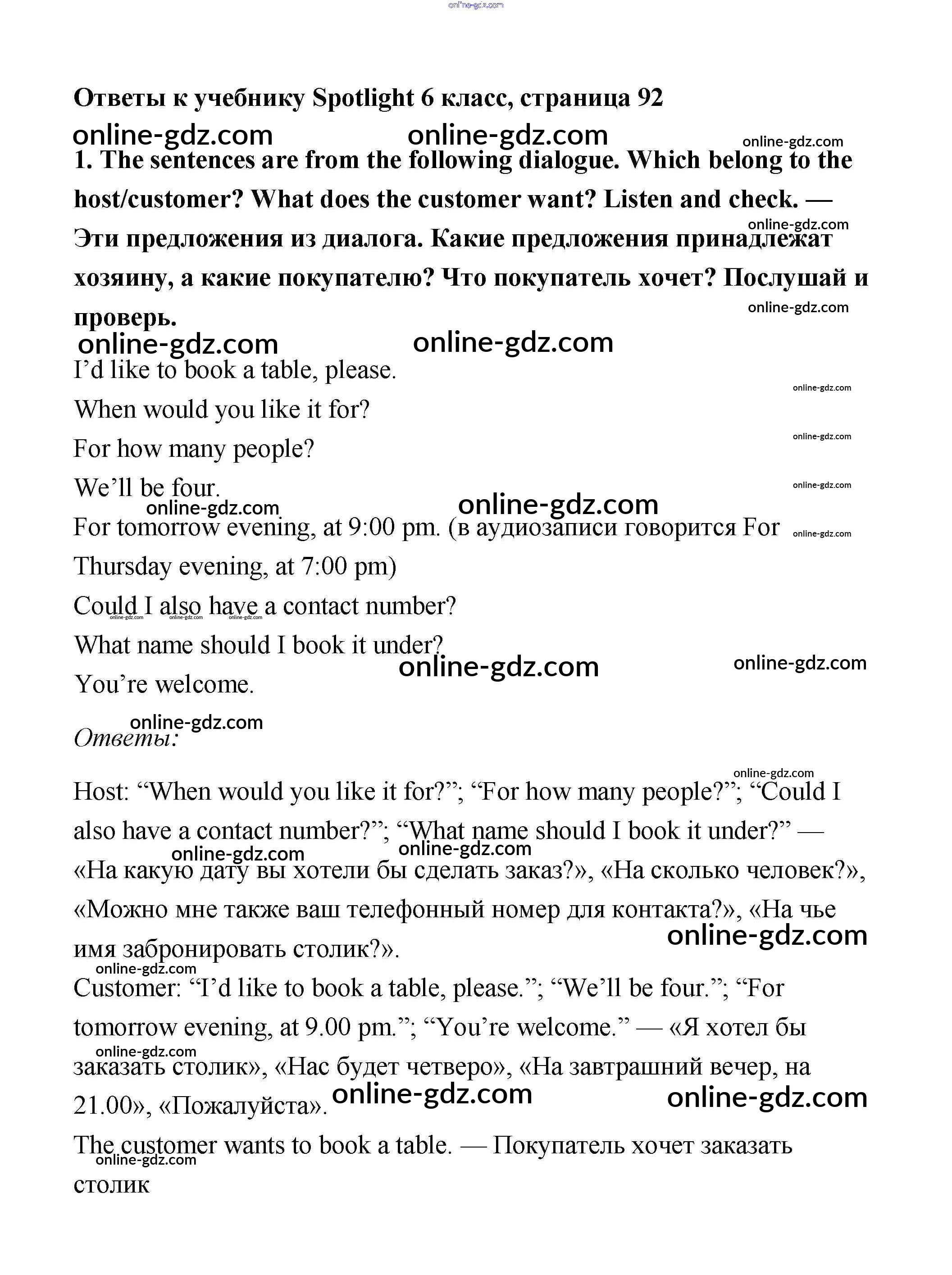 Готовые домашние задания по Английскому языку за 6 класс Учебник Ваулина, Дули Spotlight 2017 - Module 9. Food & Refreshments. Страницы 92