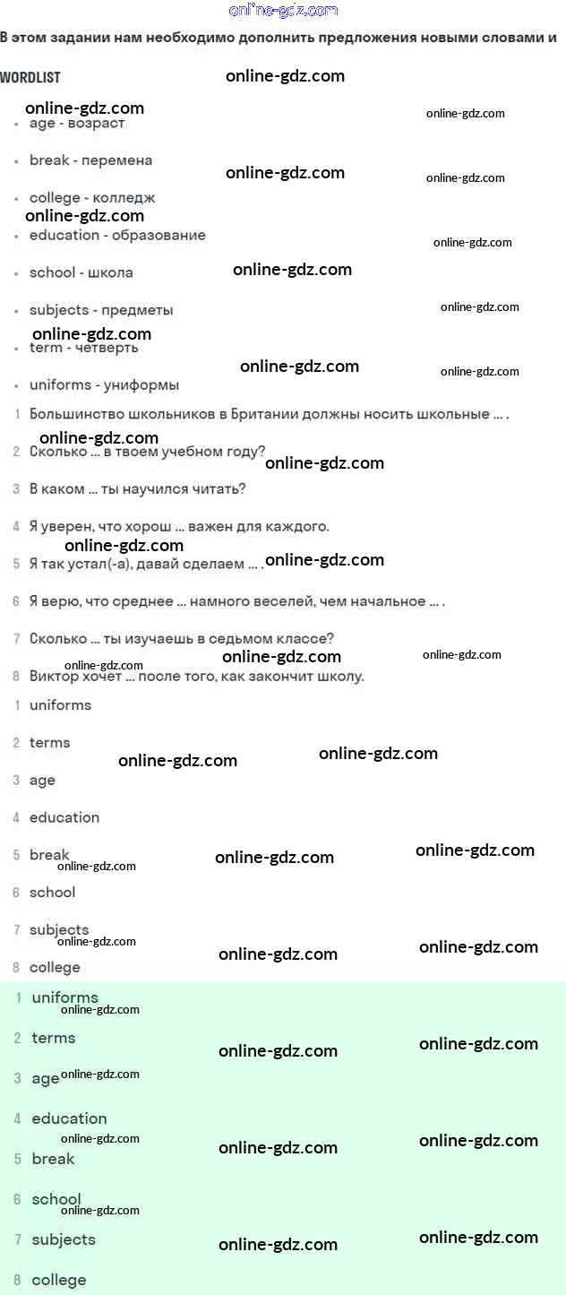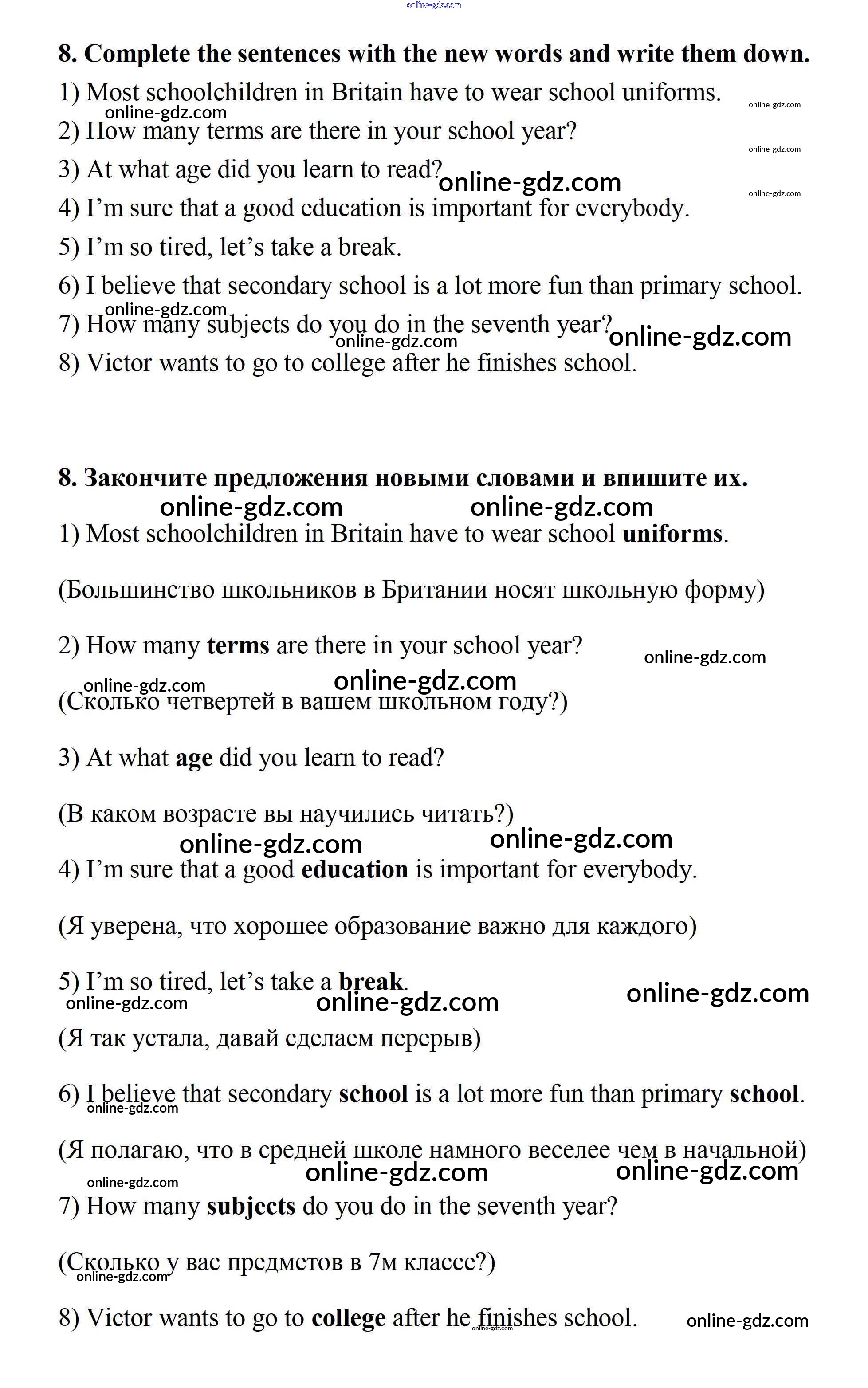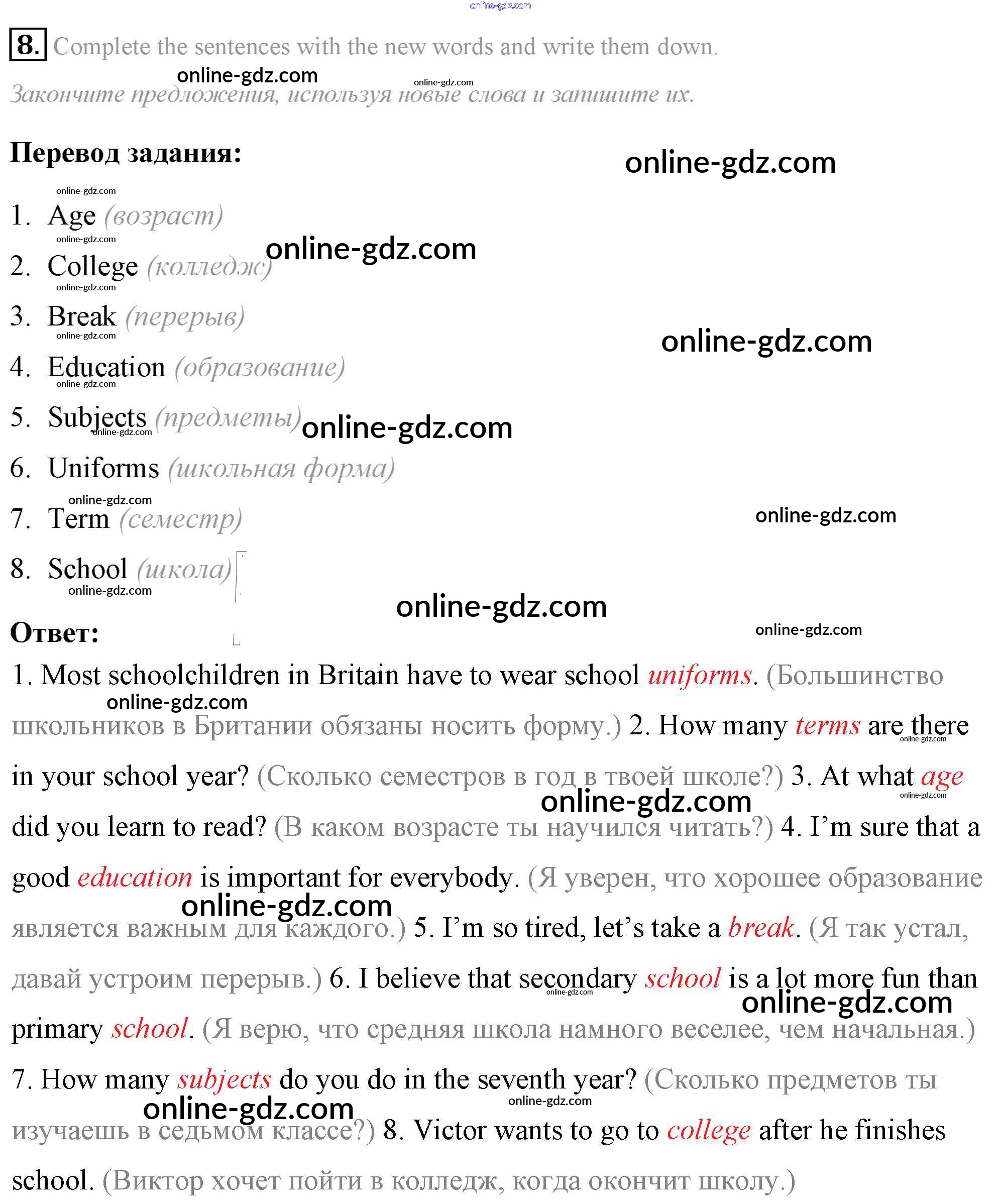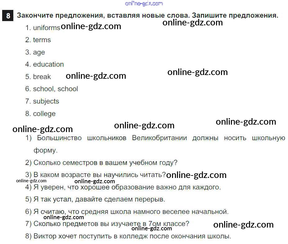Готовые домашние задания по Английскому языку за 7 класс Учебник Афанасьева, Михеева Rainbow 2019 - Step 4 UNIT 1. SCHOOLS AND SCHOOLING. 8