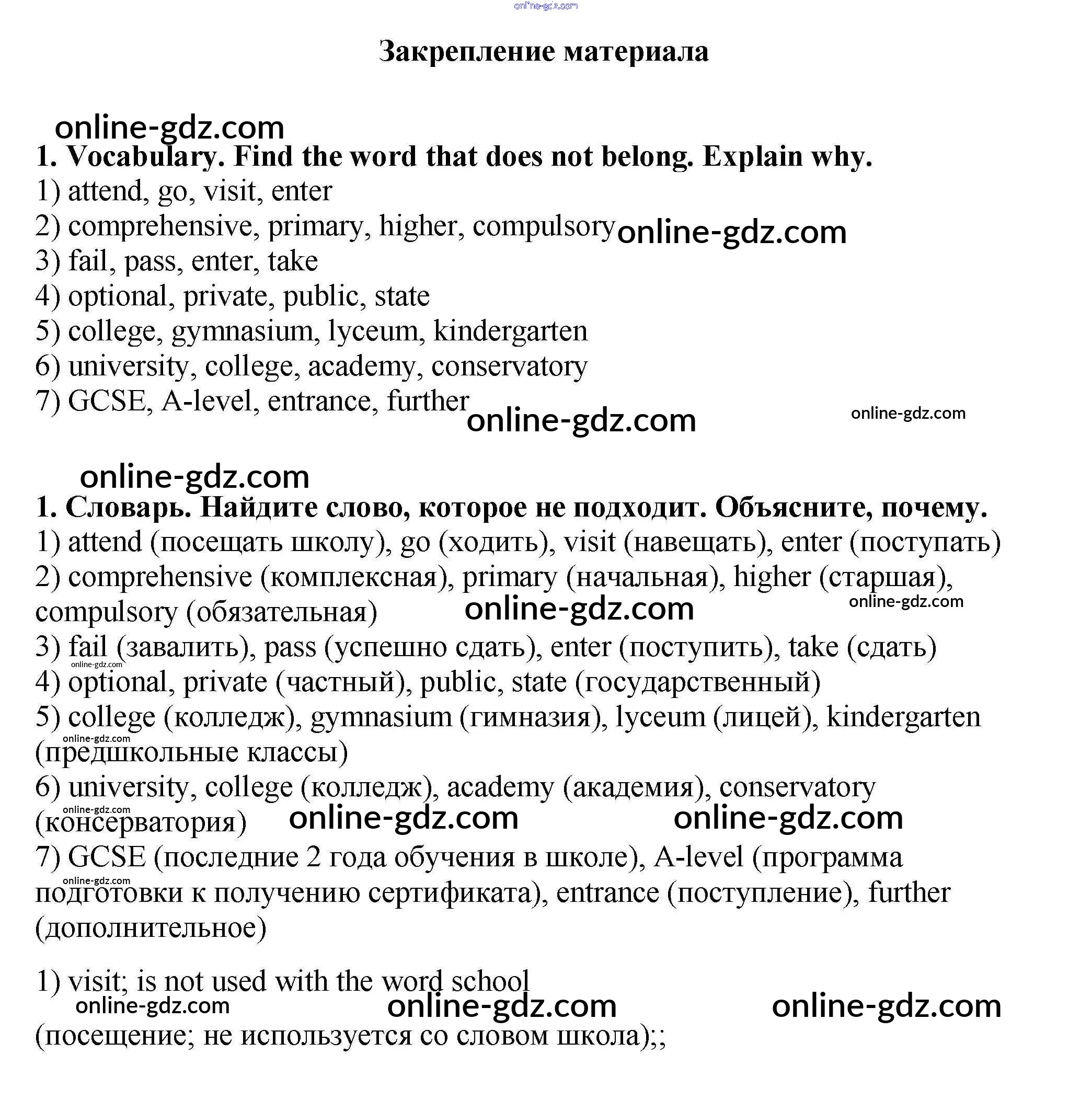 Готовые домашние задания по Английскому языку за 9 класс Рабочая тетрадь Кузовлев, Перегудова УМК 2016 - Consolidation Unit 4. What school do you go to? 1