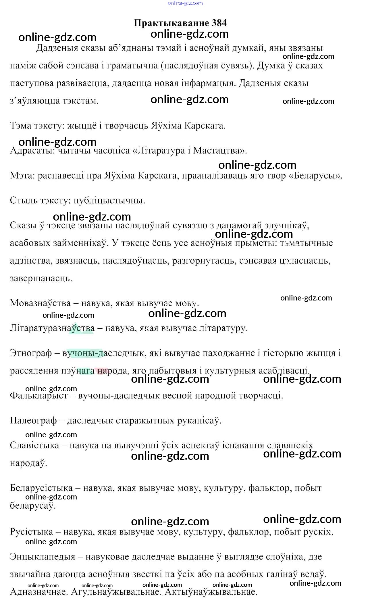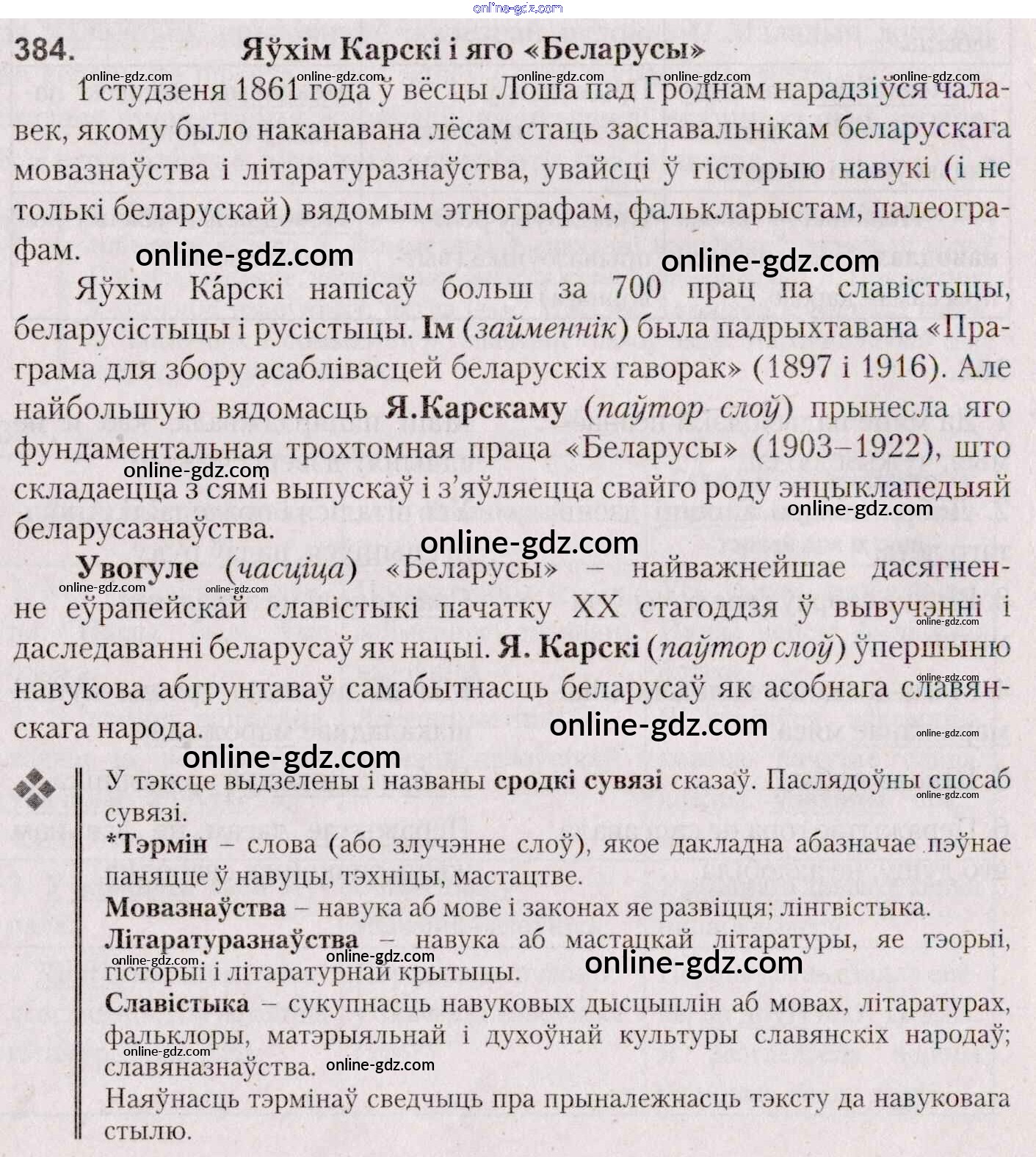Готовые домашние задания по Белорусскому языку за 7 класс Учебник Валочка, Язерская 2020 - Практыкаванні 384