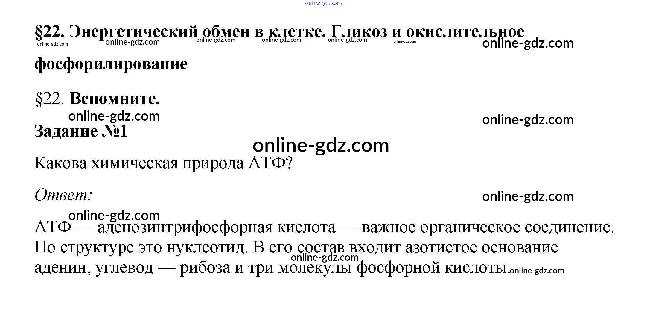 Готовые домашние задания по Биологии за 10 класс Учебник Пасечник, Каменский Линия жизни 2018 - Вспомните §22. Энергетический обмен в клетке 1