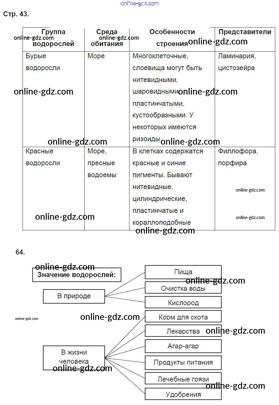 Готовые домашние задания по Биологии за 5 класс Рабочая тетрадь Пасечник Вертикаль 2015 - § 18. Водоросли стр. 43