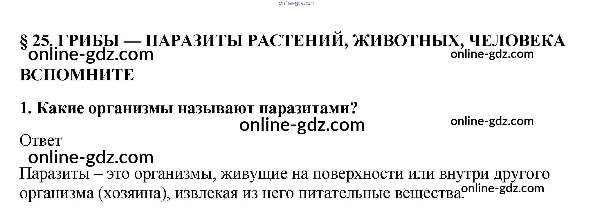 Готовые домашние задания по Биологии за 5, 6 класс Учебник Пасечник, Суматохин Линия жизни 2020 - Вспомните §25. Грибы — паразиты растений, животных, человека 1
