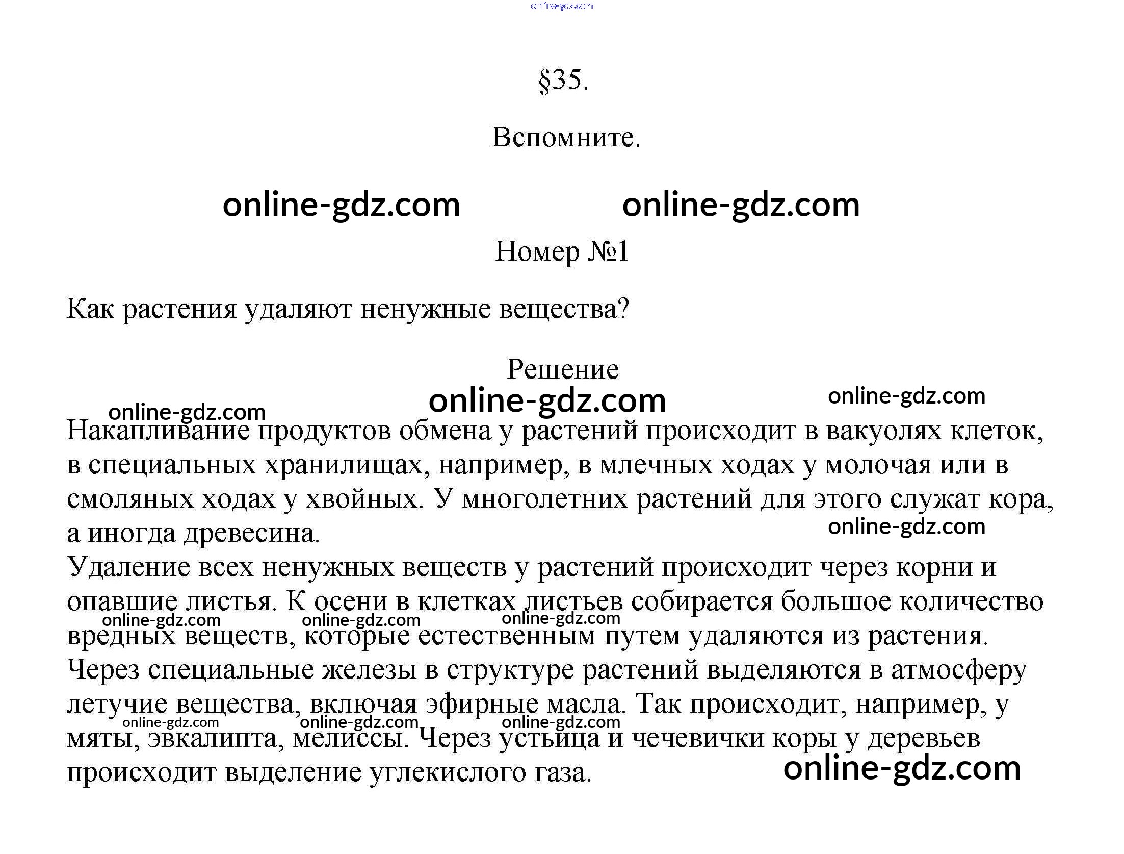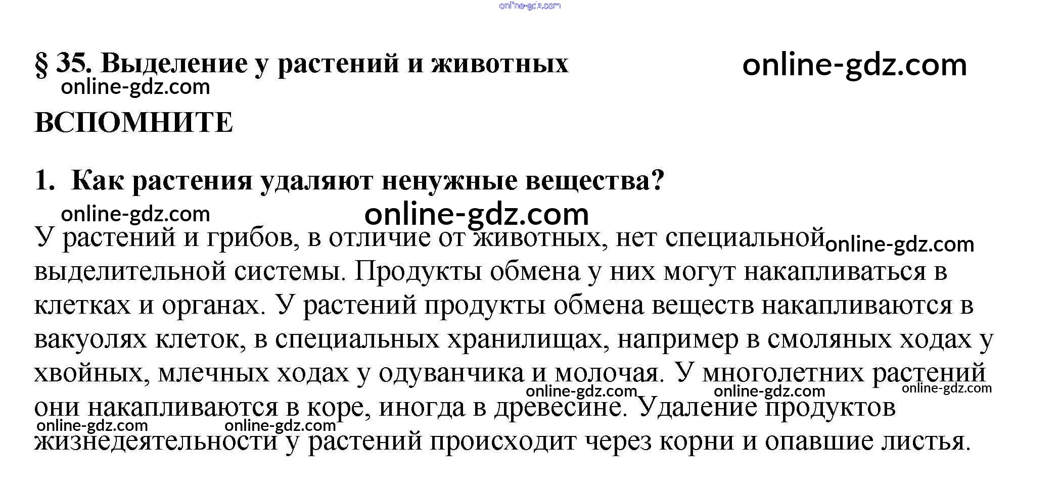 Готовые домашние задания по Биологии за 5, 6 класс Учебник Пасечник, Суматохин Линия жизни 2020 - Вспомните §35. Выделение у растений и животных 1