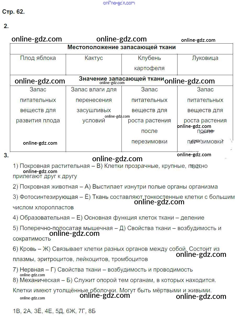 Готовые домашние задания по Биологии за 5, 6 класс Тетрадь-тренажер Сухорукова, Кучменко Сферы 2016 - Часть 1. Страницы 62