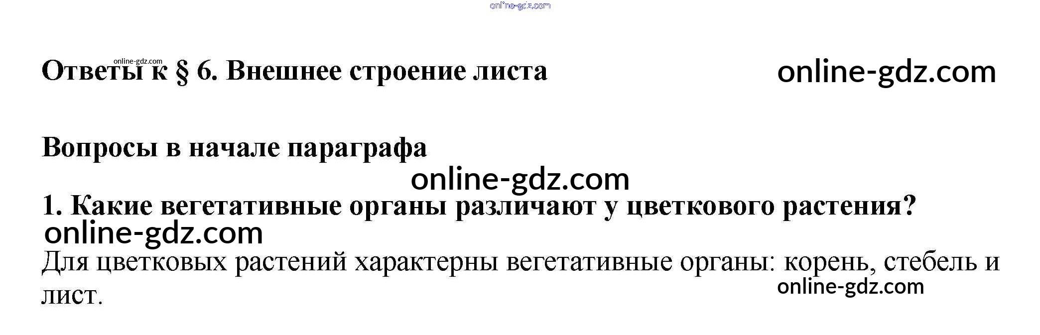 Готовые домашние задания по Биологии за 6 класс Учебник Пасечник Вертикаль 2014 - Вопросы в начале параграфа §6. Внешнее строение листа 1