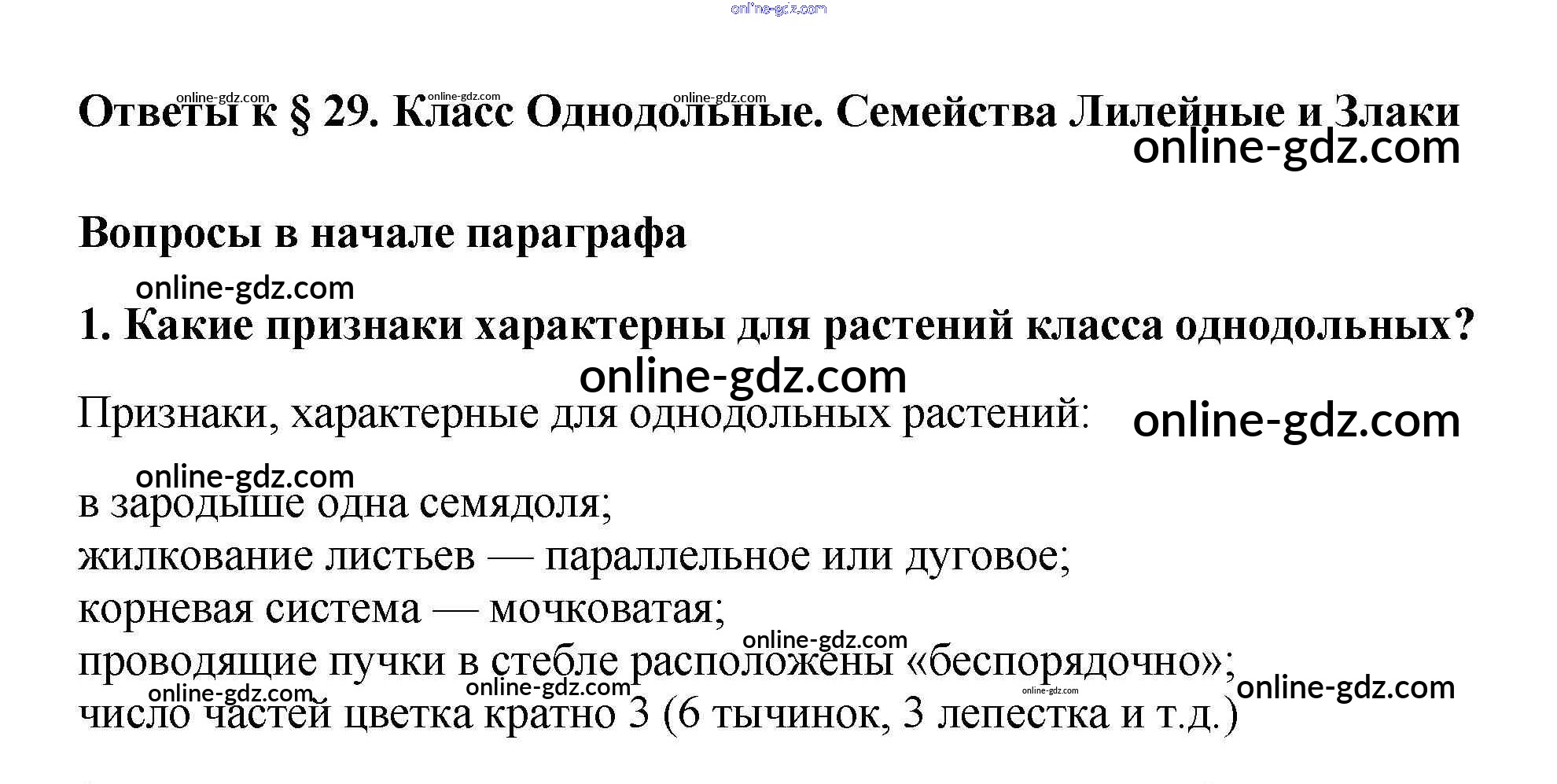 Готовые домашние задания по Биологии за 6 класс Учебник Пасечник Вертикаль 2014 - Вопросы в начале параграфа §29. Класс Однодольные. Семейства Лилейные и Злаки 1