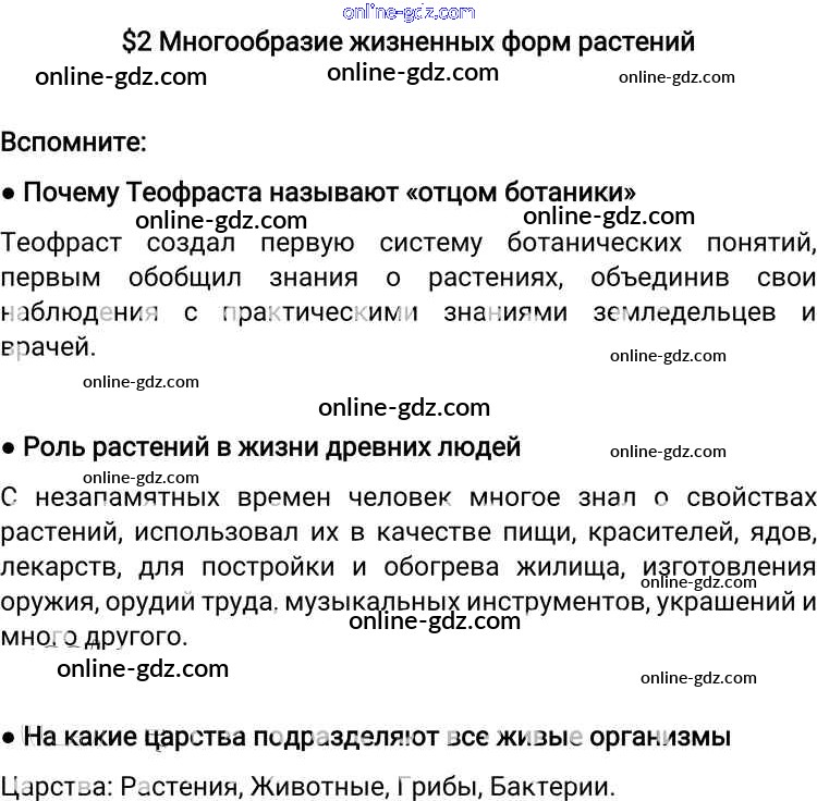 Готовые домашние задания по Биологии за 6 класс Учебник Пономарева, Корнилова Алгоритм успеха 2018 - §2. Многообразие жизненных форм растений Вспомните