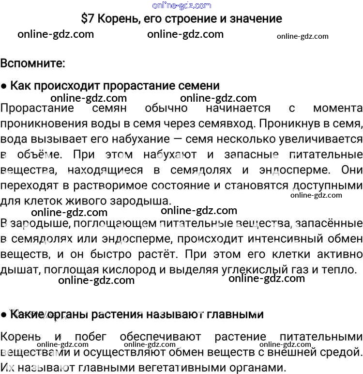 Готовые домашние задания по Биологии за 6 класс Учебник Пономарева, Корнилова Алгоритм успеха 2018 - §7. Корень, его строение и значение Вспомните