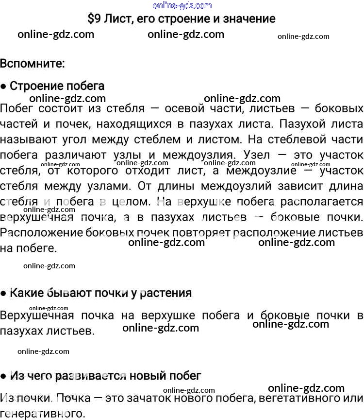 Готовые домашние задания по Биологии за 6 класс Учебник Пономарева, Корнилова Алгоритм успеха 2018 - §9. Лист, его строение и значение Вспомните