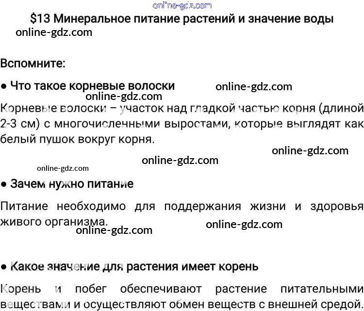 Готовые домашние задания по Биологии за 6 класс Учебник Пономарева, Корнилова Алгоритм успеха 2018 - §13. Минеральное питание растений и значение воды Вспомните