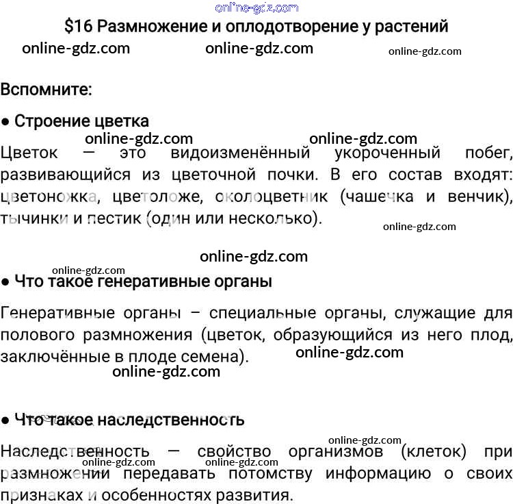 Готовые домашние задания по Биологии за 6 класс Учебник Пономарева, Корнилова Алгоритм успеха 2018 - §16. Размножение и оплодотворение у растений Вспомните