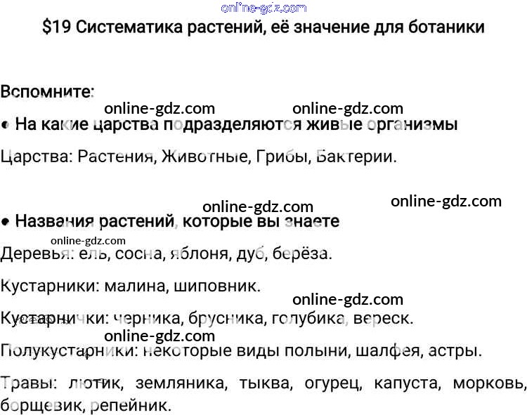 Готовые домашние задания по Биологии за 6 класс Учебник Пономарева, Корнилова Алгоритм успеха 2018 - §19. Систематика растений, её значение для ботаники Вспомните