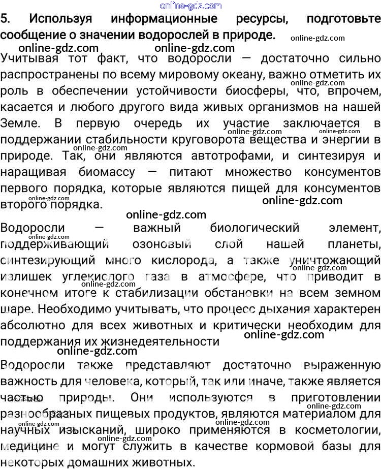 Готовые домашние задания по Биологии за 6 класс Учебник Пономарева, Корнилова Алгоритм успеха 2018 - Вопросы §20. Водоросли, их разнообразие и значение в природе 5