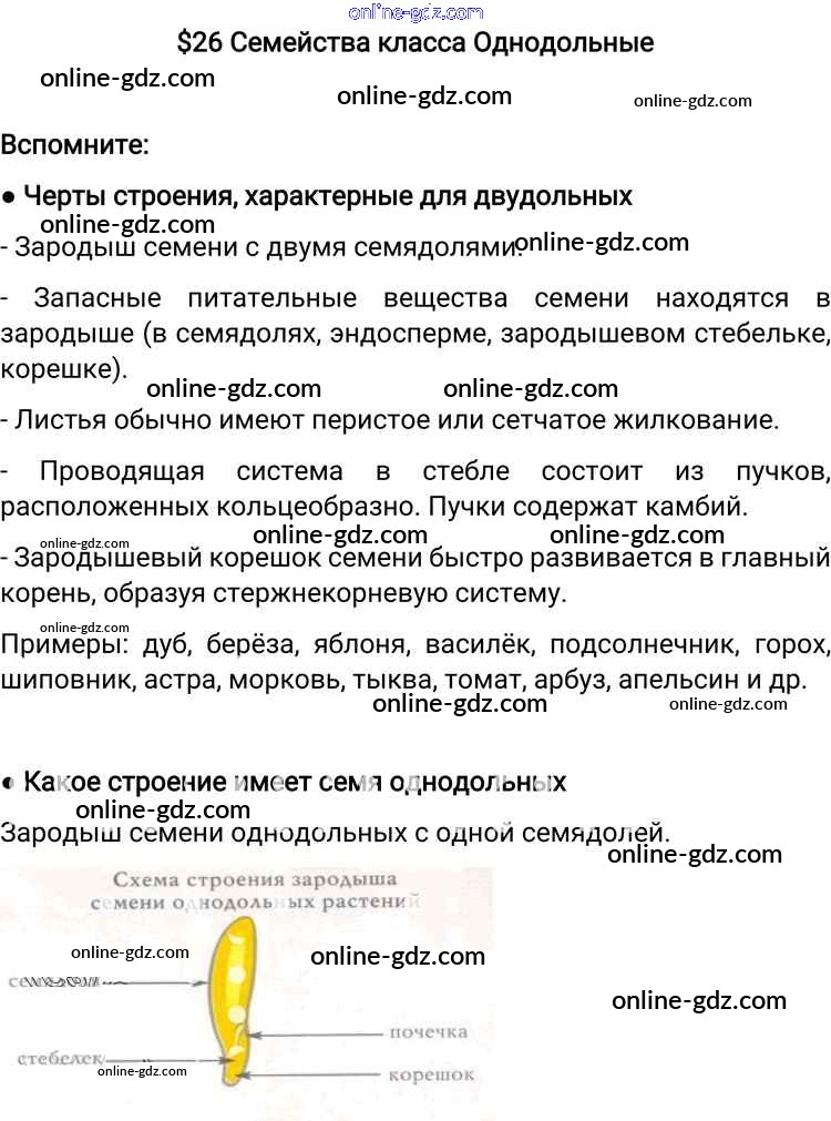 Готовые домашние задания по Биологии за 6 класс Учебник Пономарева, Корнилова Алгоритм успеха 2018 - §26. Семейства класса Однодольные Вспомните