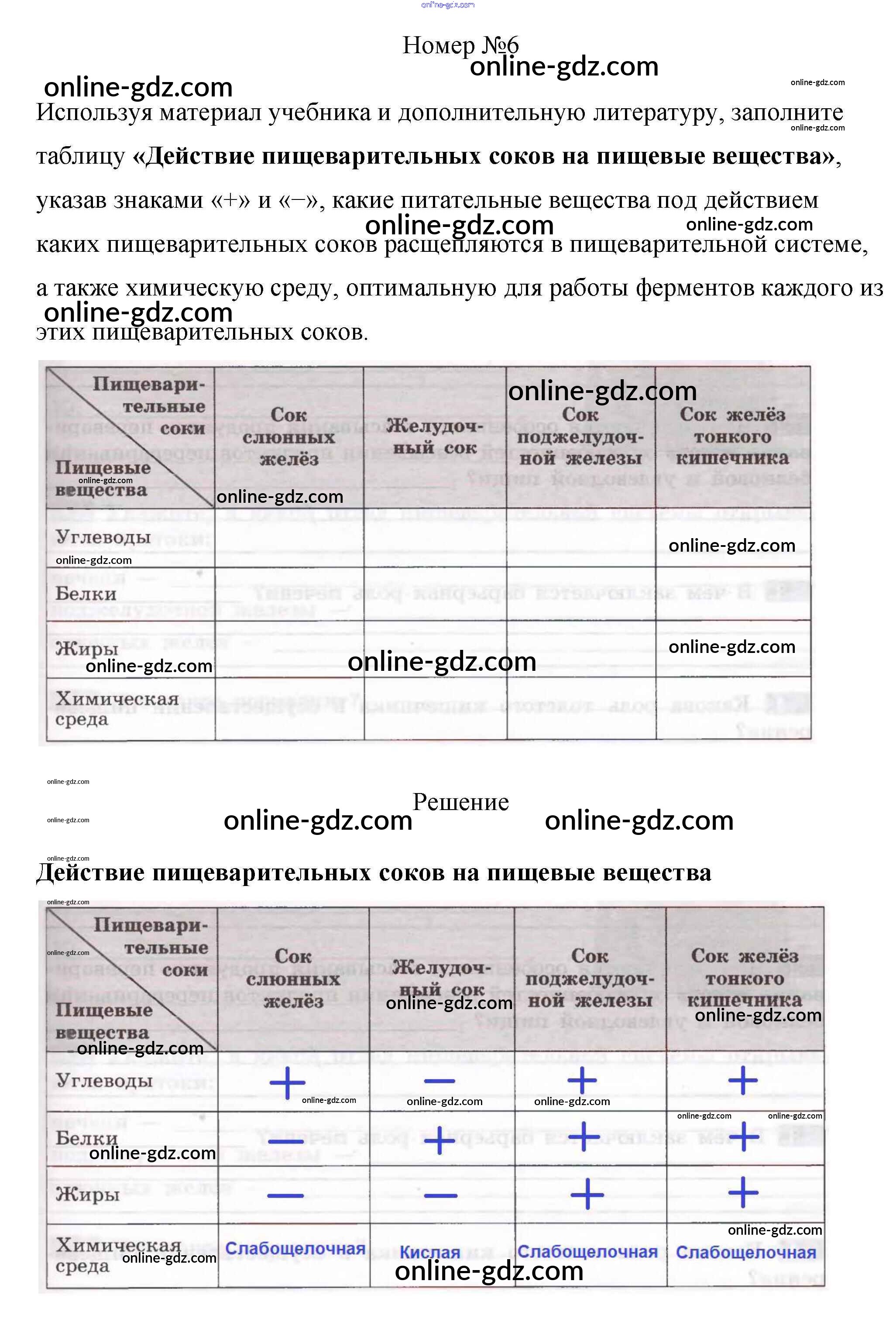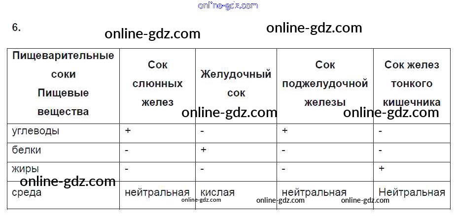 Готовые домашние задания по Биологии за 8 класс Рабочая тетрадь Пасечник, Швецов Линия жизни 2019 - §26. Пищеварение в желудке и кишечнике 6