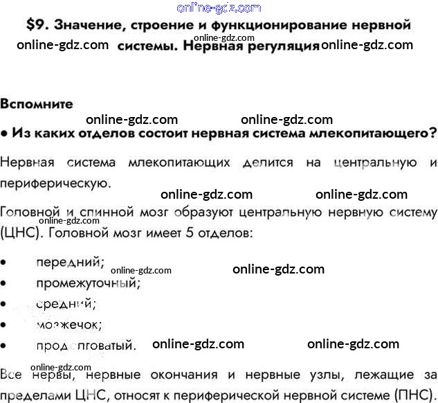 Готовые домашние задания по Биологии за 8 класс Учебник Драгомилов, Маш Алгоритм успеха 2022 - §9. Значение, строение и функционирование нервной системы. Нервная регуляция Глава 2. Регуляторные системы организма Вспомним