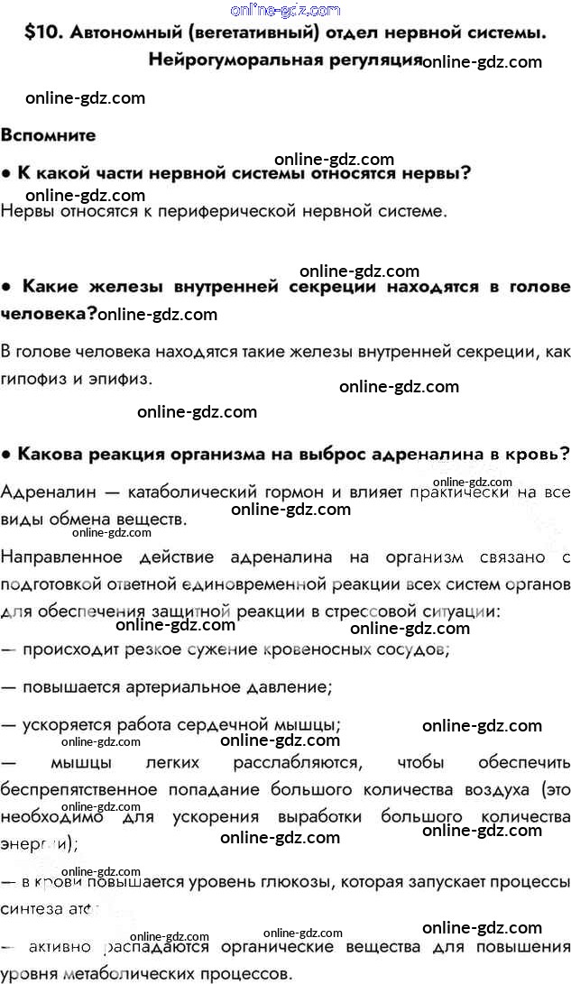 Готовые домашние задания по Биологии за 8 класс Учебник Драгомилов, Маш Алгоритм успеха 2022 - §10. Автономный (вегетативный) отдел нервной системы. Нейрогуморальная регуляция Глава 2. Регуляторные системы организма Вспомним