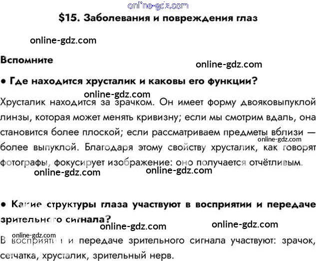 Готовые домашние задания по Биологии за 8 класс Учебник Драгомилов, Маш Алгоритм успеха 2022 - §15. Заболевания и повреждения глаз Глава 3. Органы чувств. Анализаторы Вспомним