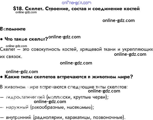 Готовые домашние задания по Биологии за 8 класс Учебник Драгомилов, Маш Алгоритм успеха 2022 - §18. Скелет. Строение, состав и соединение костей Глава 4. Опорно-двигательная система Вспомним