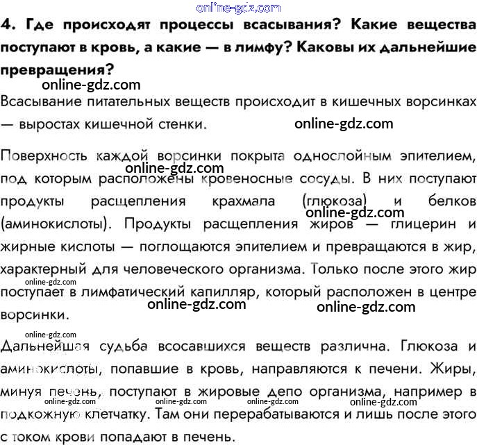 Готовые домашние задания по Биологии за 8 класс Учебник Драгомилов, Маш Алгоритм успеха 2022 - Вопросы §40. Пищеварение в кишечнике. Всасывание питательных веществ 4