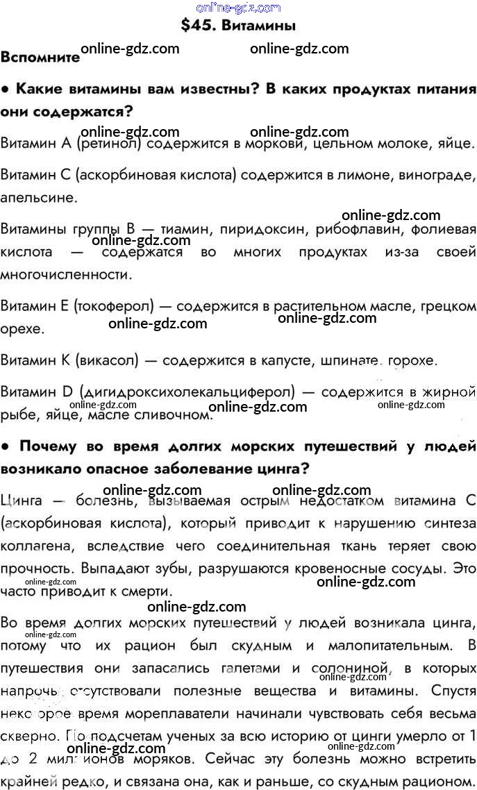 Готовые домашние задания по Биологии за 8 класс Учебник Драгомилов, Маш Алгоритм успеха 2022 - §45. Витамины Глава 8. Обмен веществ и энергии Вспомним