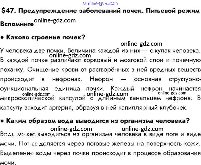 Готовые домашние задания по Биологии за 8 класс Учебник Драгомилов, Маш Алгоритм успеха 2022 - §47. Предупреждение заболеваний почек. Питьевой режим Глава 9. Мочевыделительная система и кожа Вспомним
